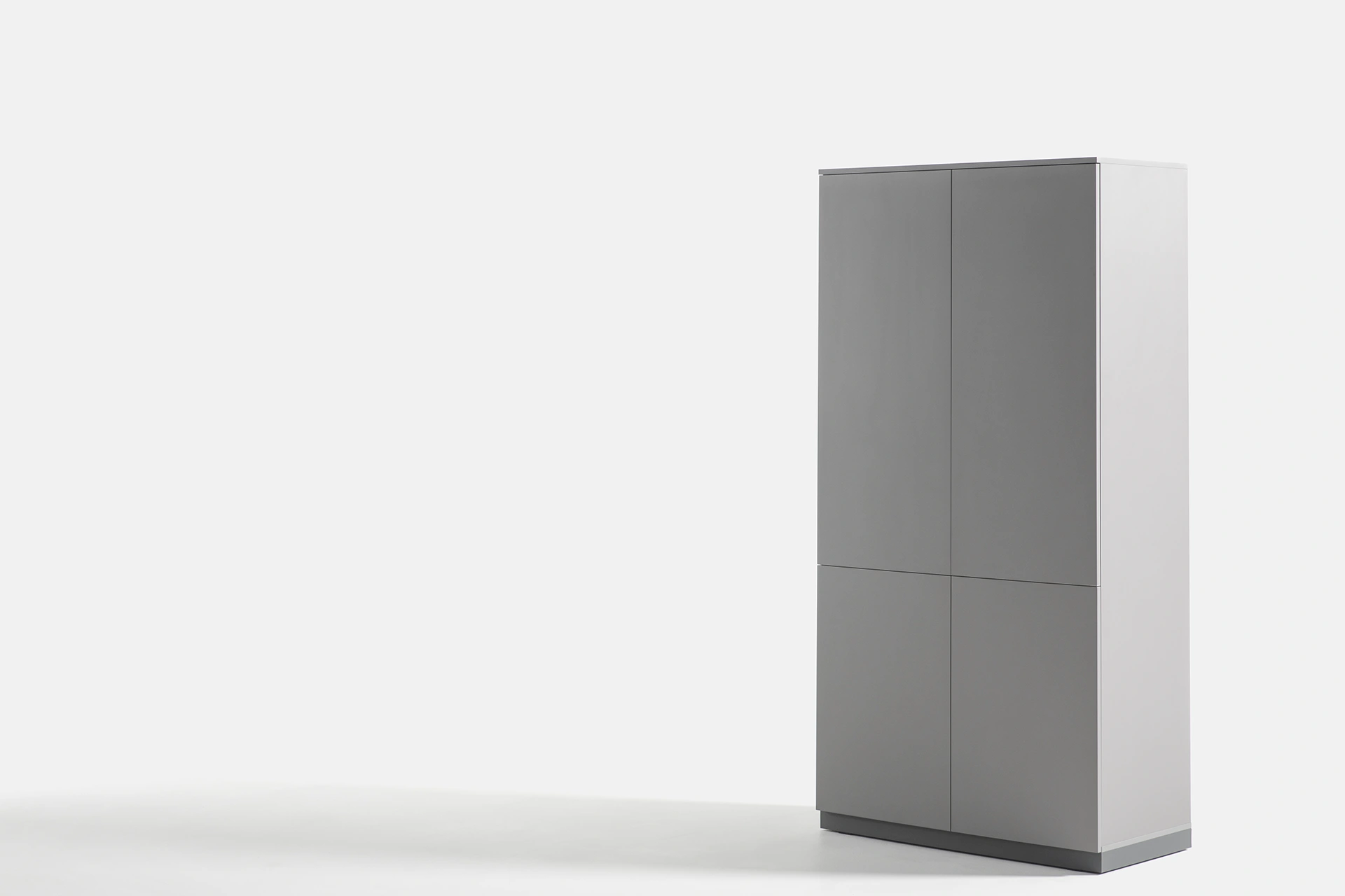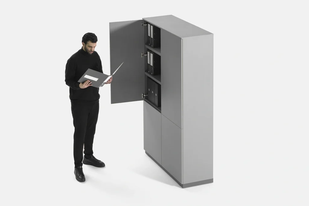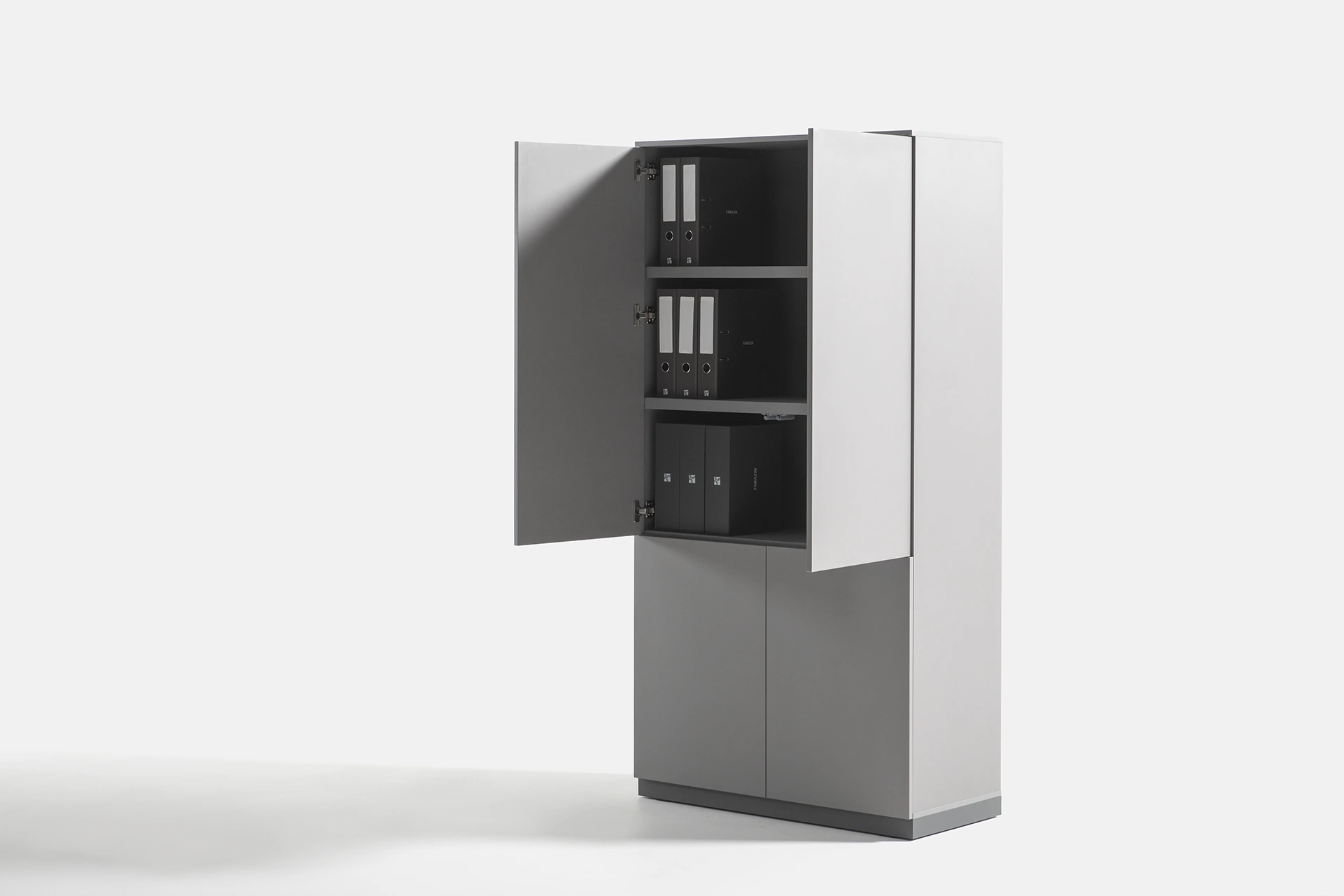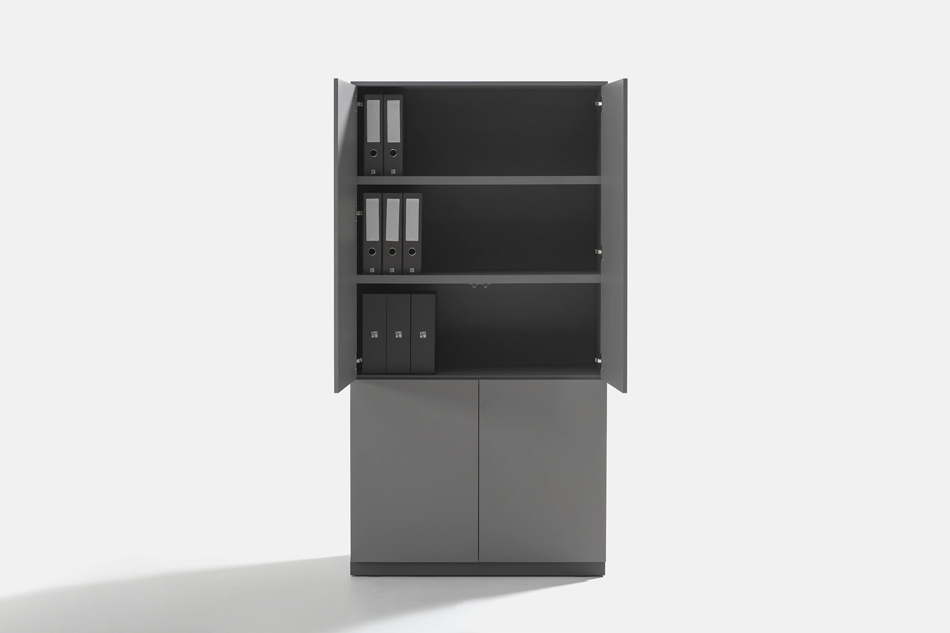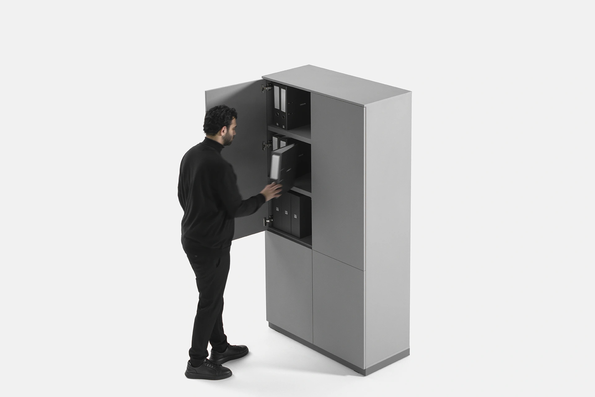 این کابینت اداری با چهار درب قدی طراحی شده است؛ دو درب در قسمت بالایی و دو درب در قسمت پایینی که فضای داخلی کابینت را به دو بخش مجزا تقسیم می‌کند. این طراحی امکان سازمان‌دهی بهتر اسناد و وسایل و دسترسی آسان به محتویات هر بخش را فراهم می‌کند.