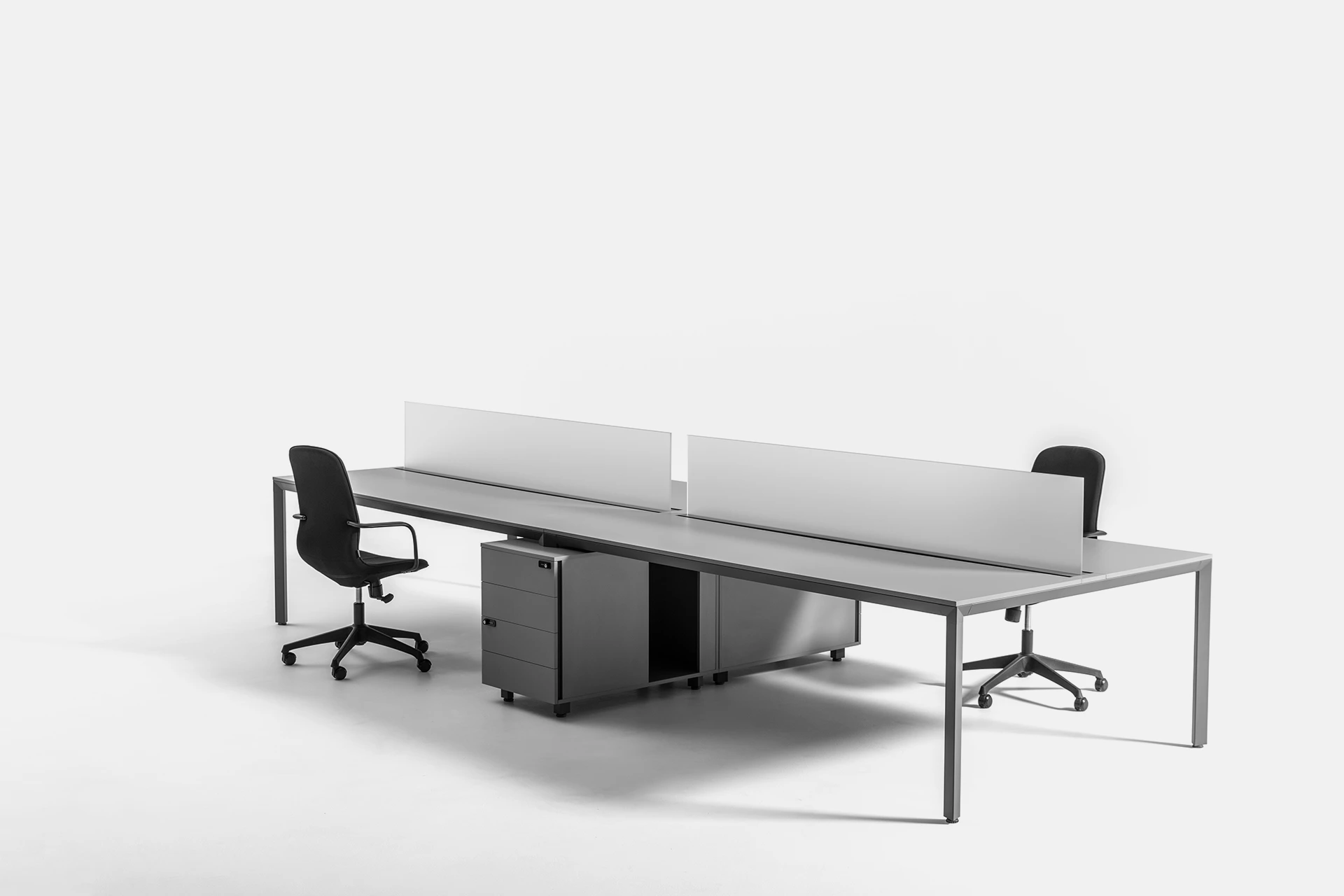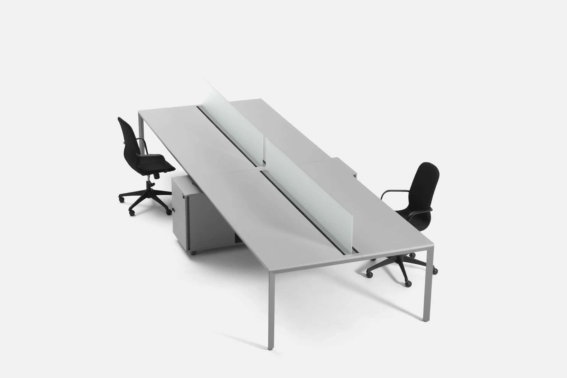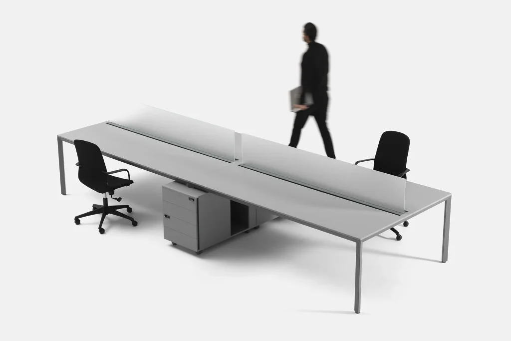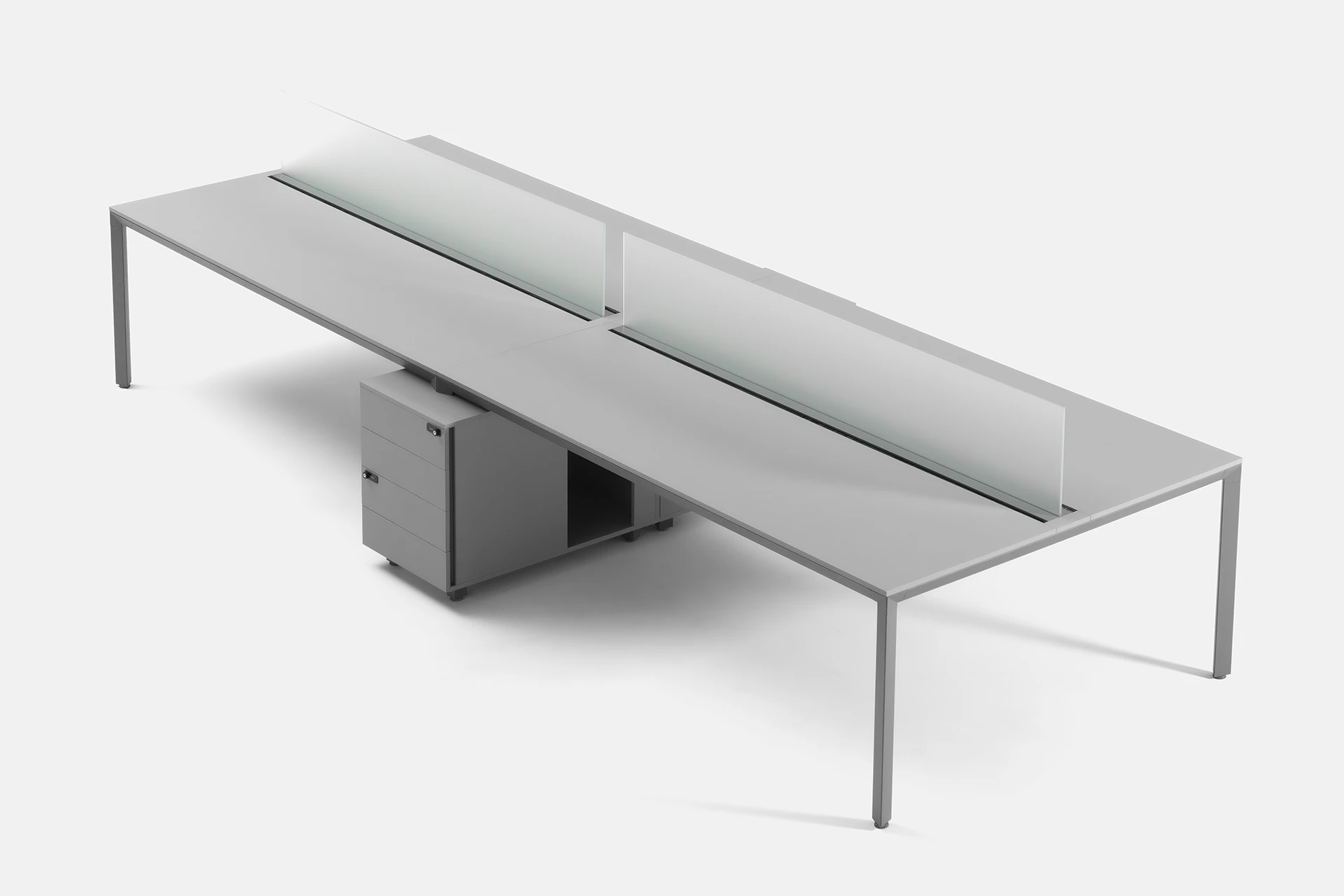 این میز ورکاستیشن چهار کاربره با استراکچر تمامآلومینیومی، محیطی مدرن و کارآمد برای تیمهای کاری فراهم میکند. کاربران روبروی یکدیگر قرار میگیرند و با دیوایدر شیشهای یا آکوستیک، فضای کاری هر فرد بهصورت خصوصی و آرام حفظ میشود. اسکلت سبک و مقاوم میز، دوام طولانیمدت و استحکام بالای ساختار را تضمین کرده و جلوهای شیک و مینیمال به دفتر میبخشد.