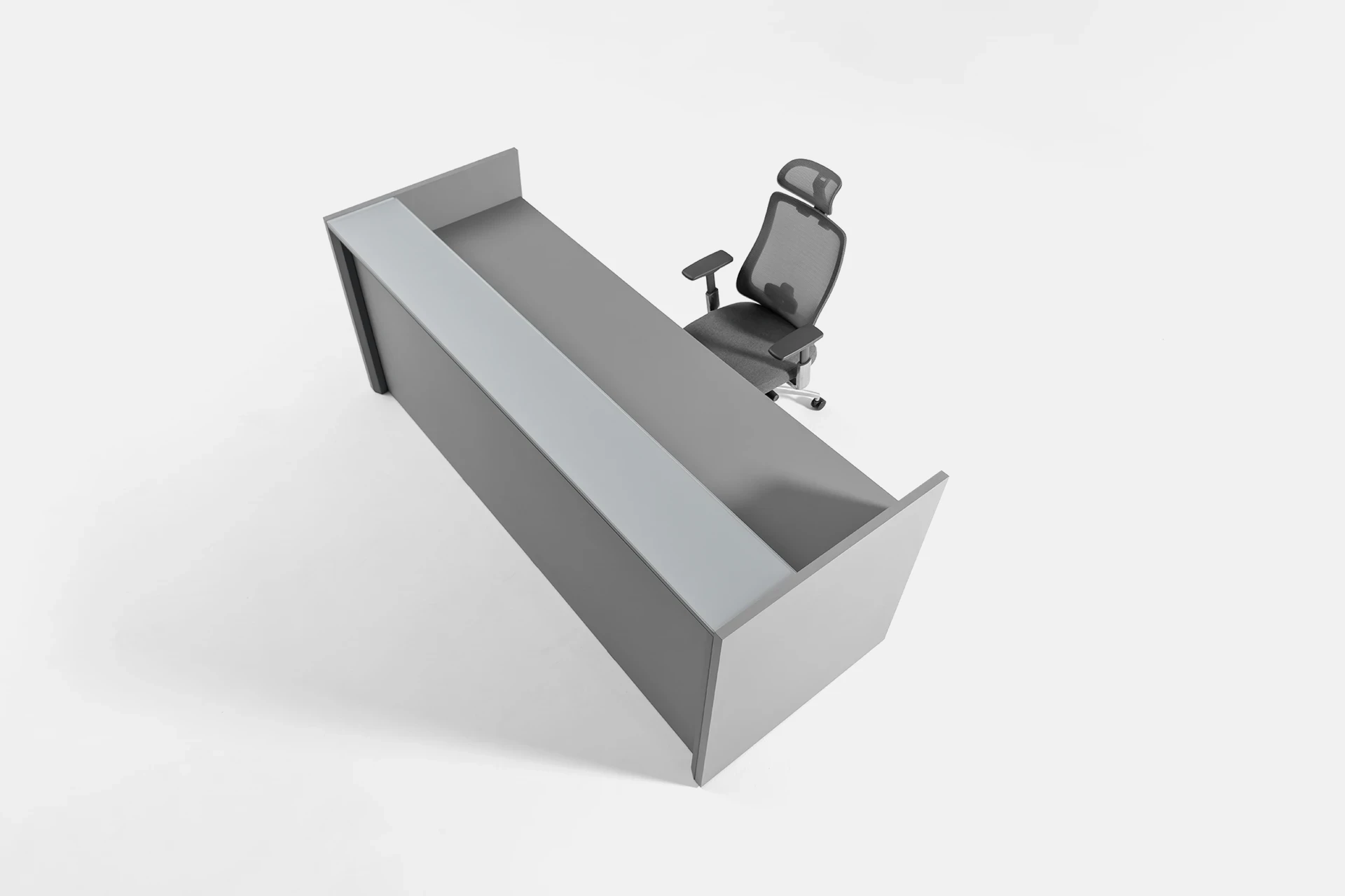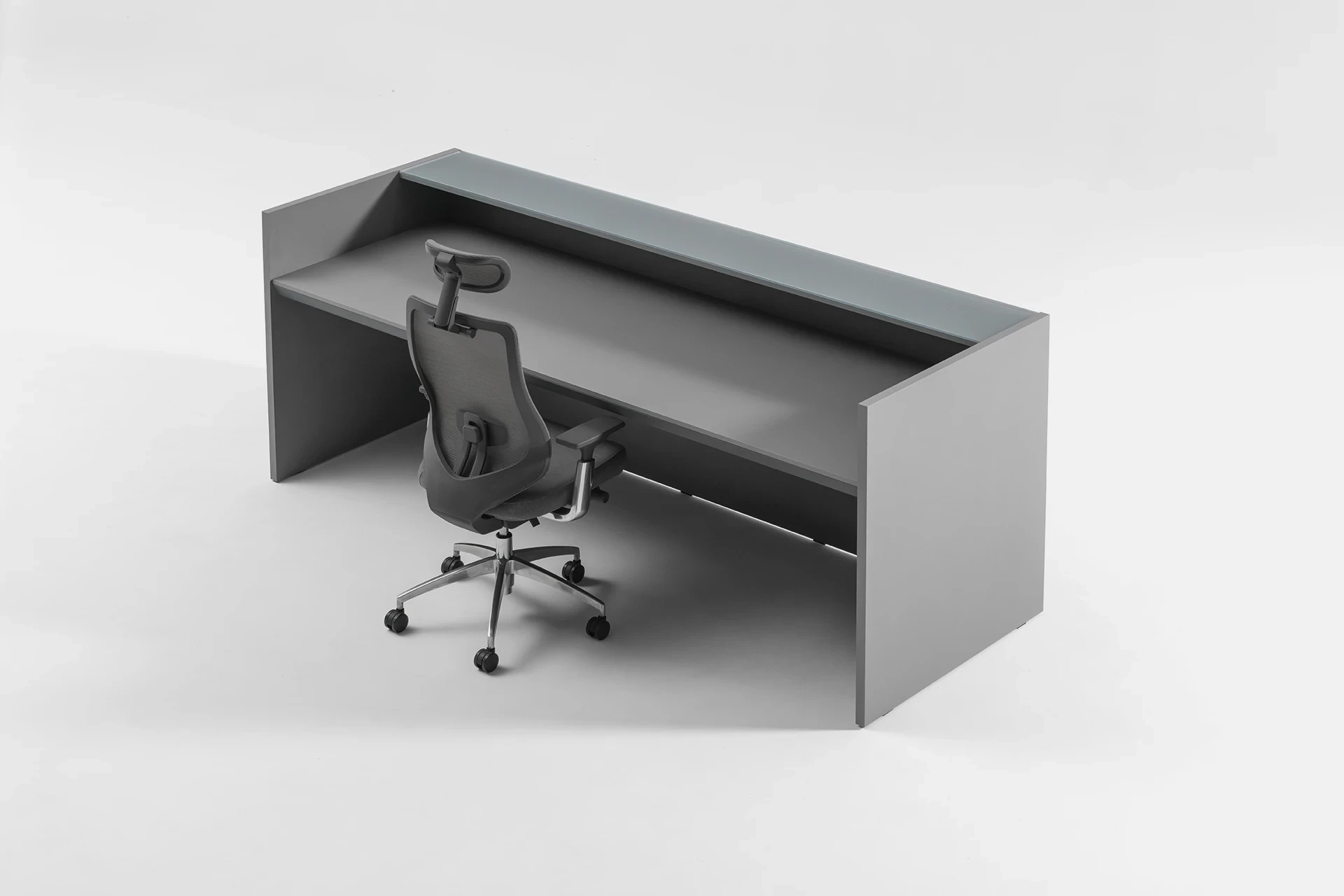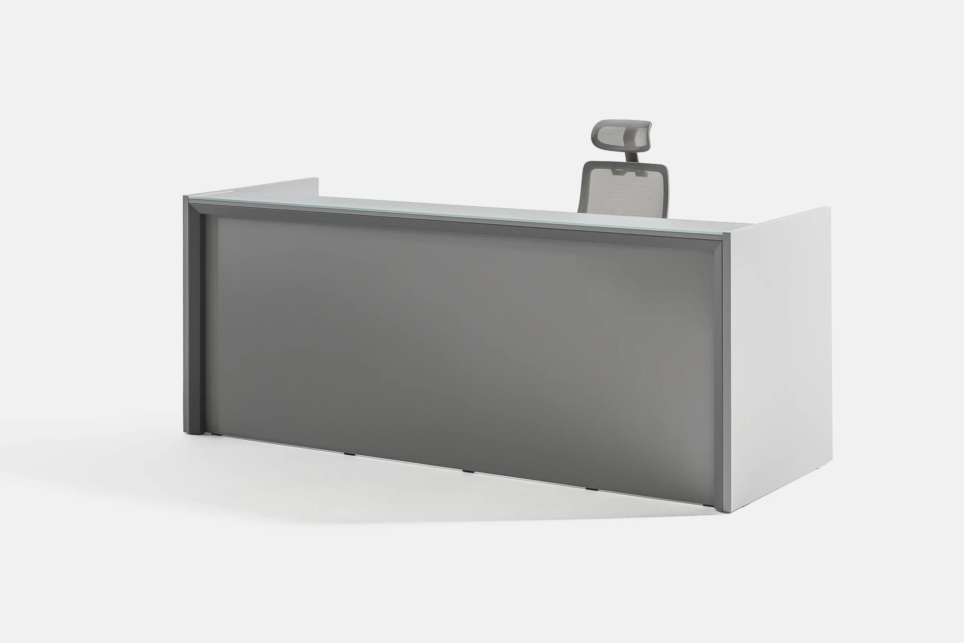The countertop is made of glass, adding visual appeal and enhancing the modern, luxurious look of the space. The minimalist design of the table perfectly complements modern office decor, offering a comfortable and practical experience for both users and clients.