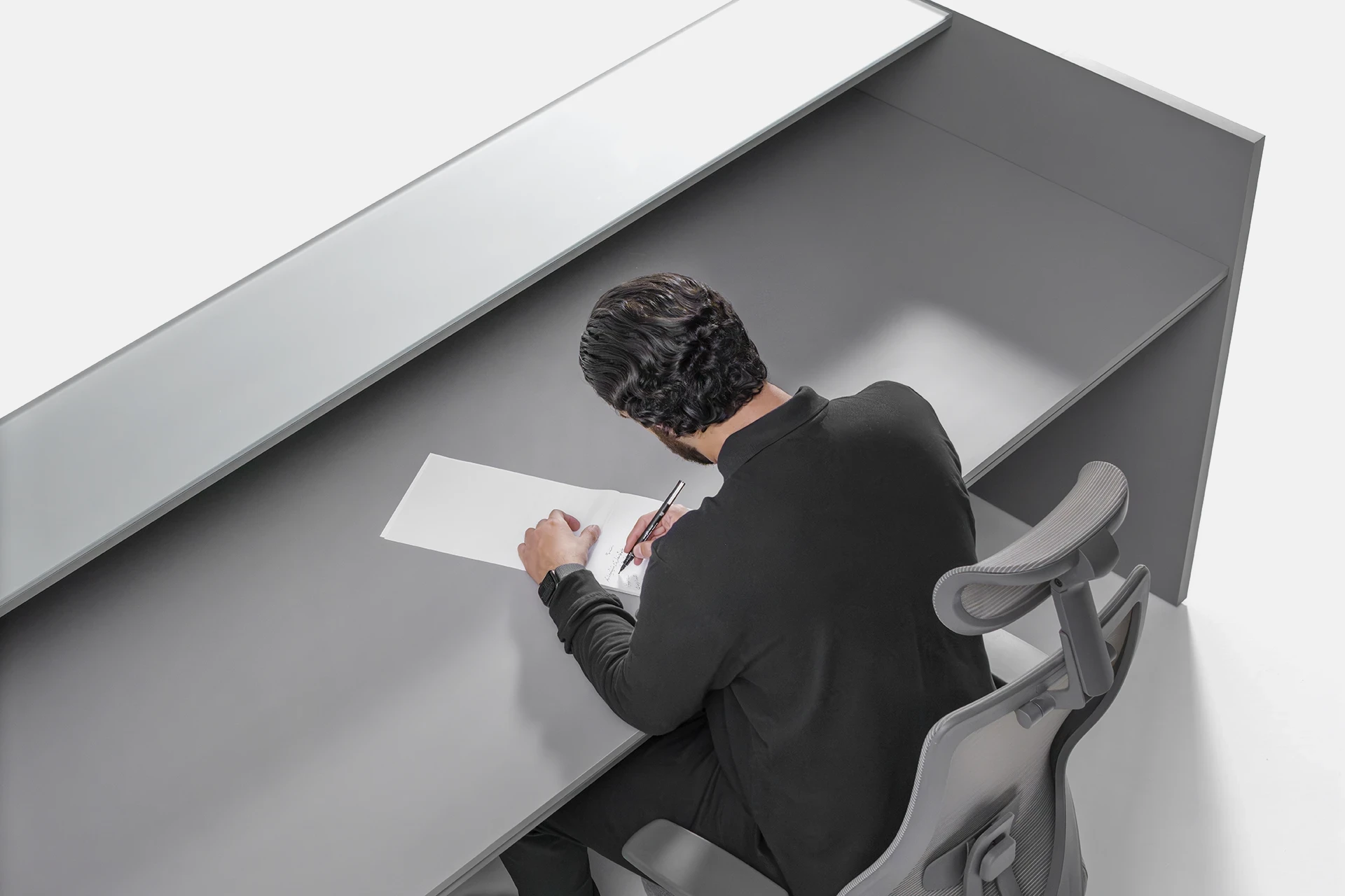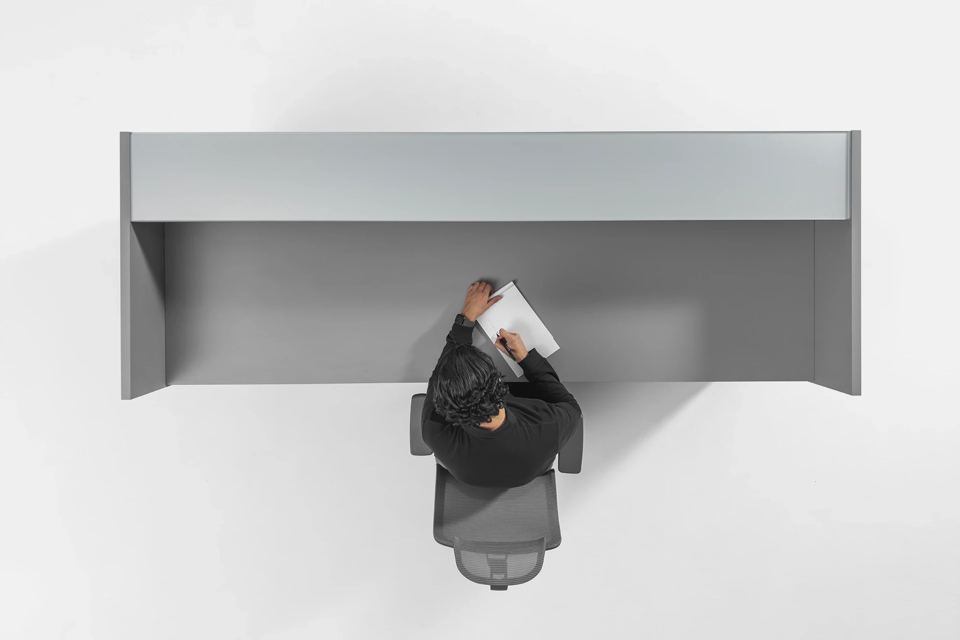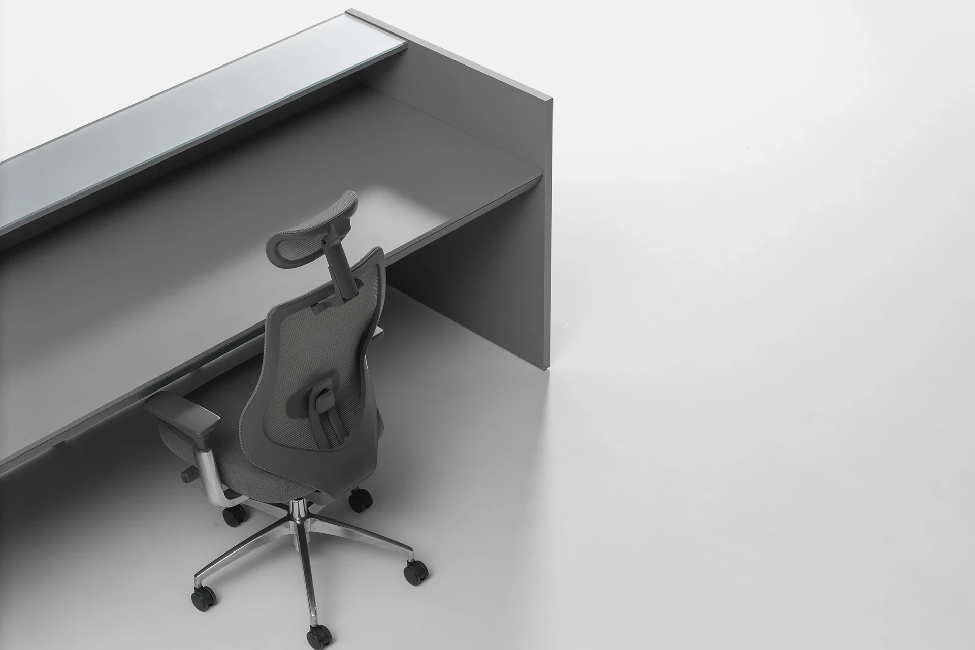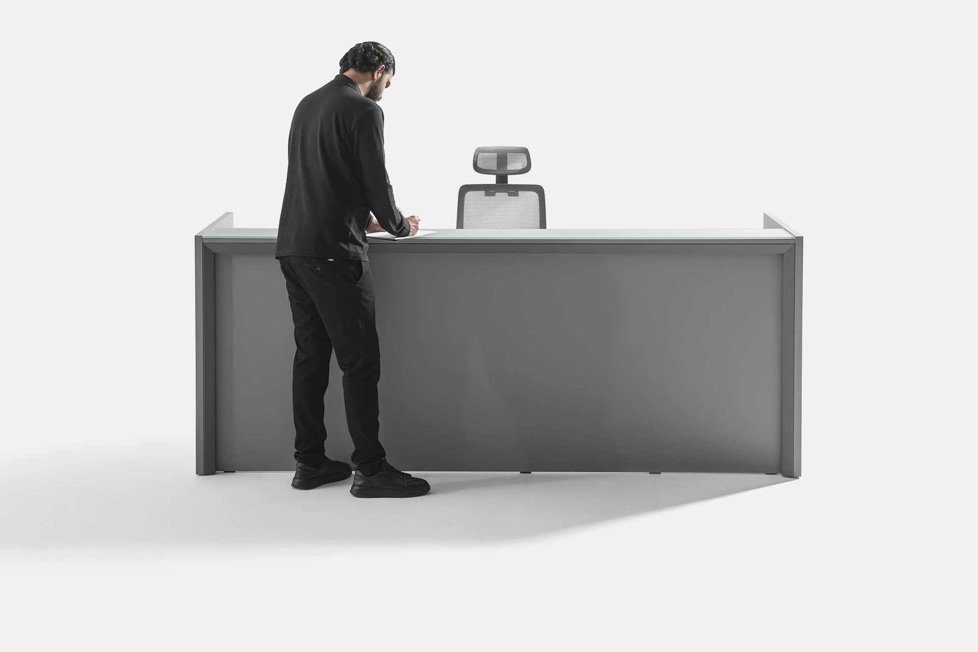 The countertop is made of glass, adding visual appeal and enhancing the modern, luxurious look of the space. The minimalist design of the table perfectly complements modern office decor, offering a comfortable and practical experience for both users and clients.