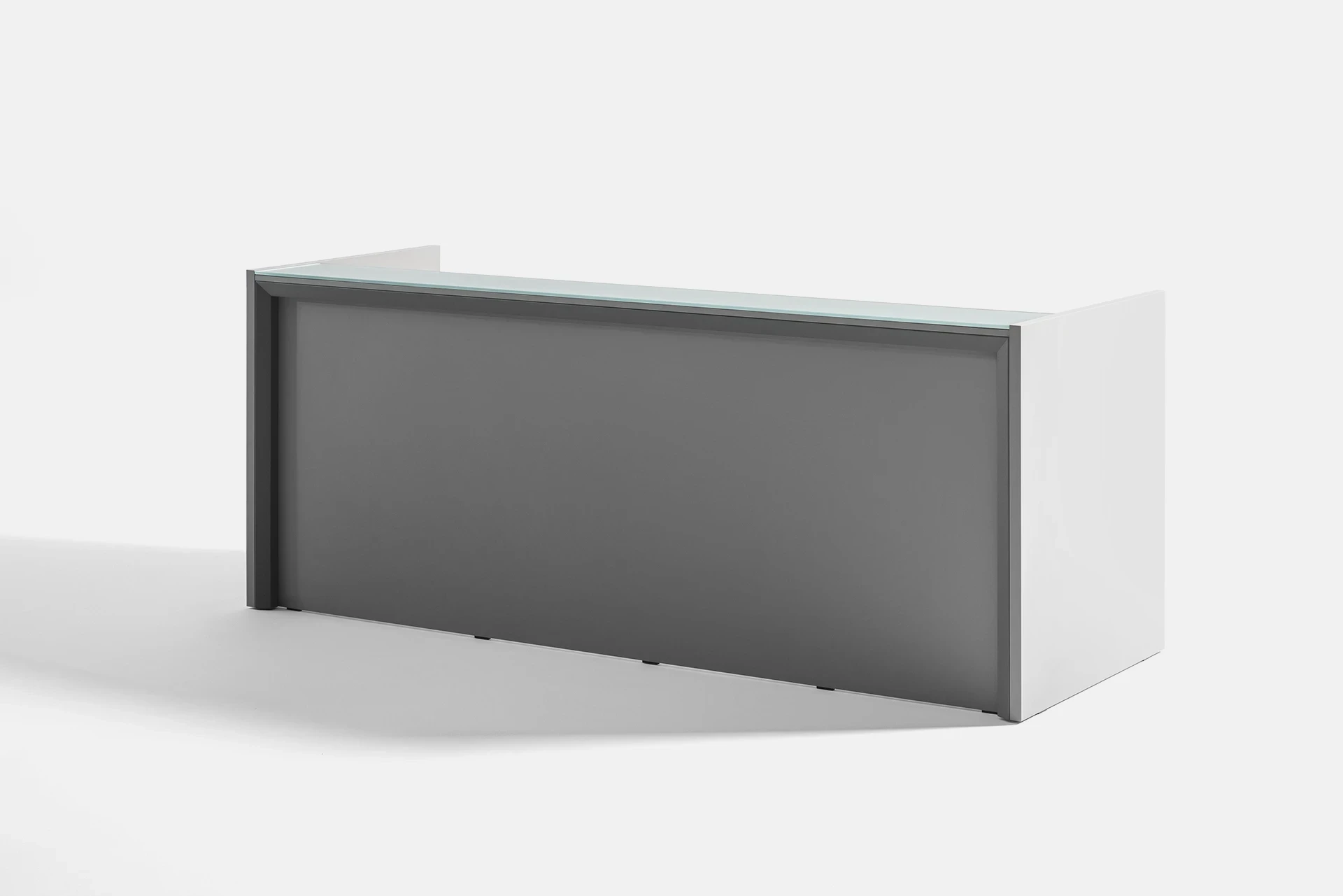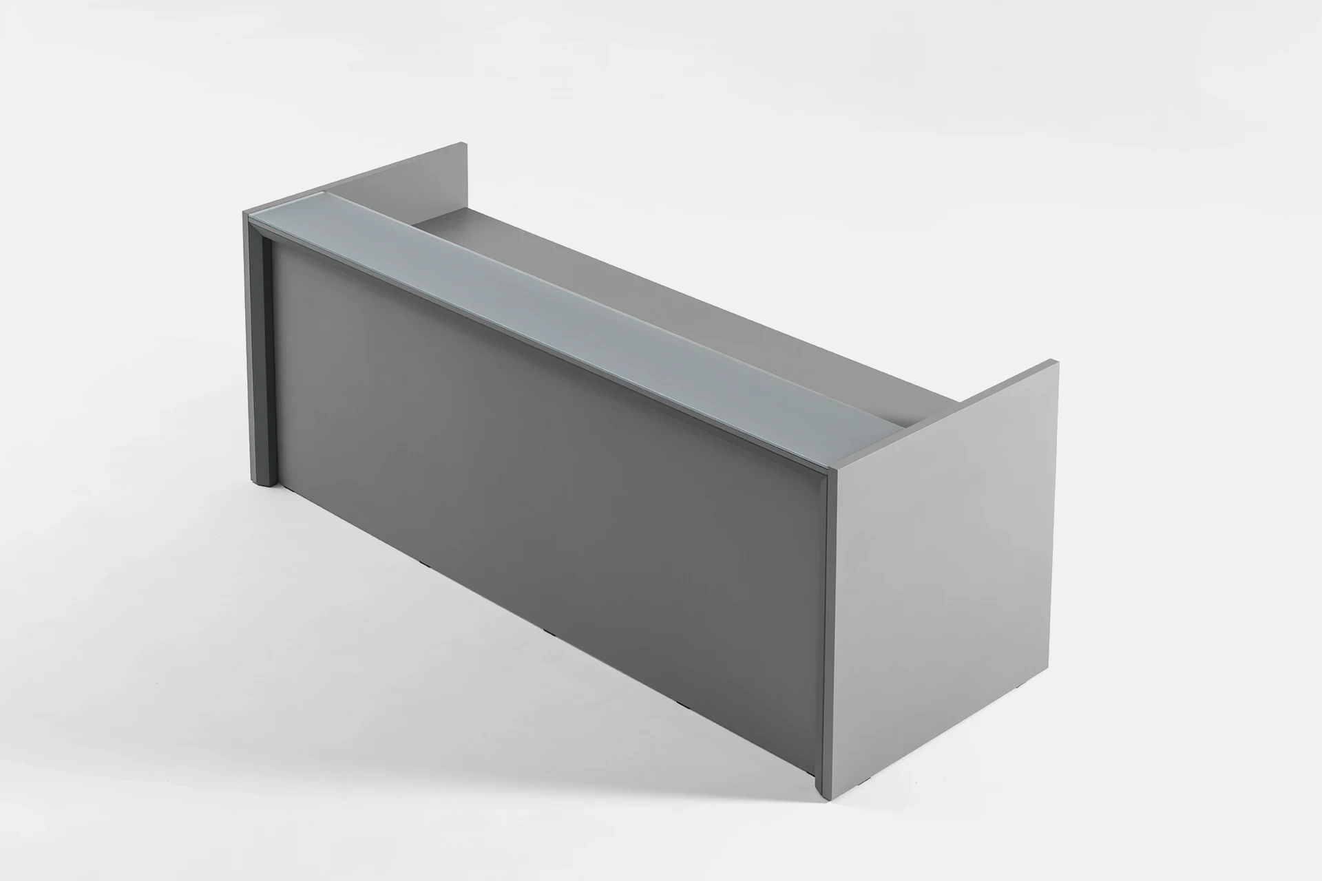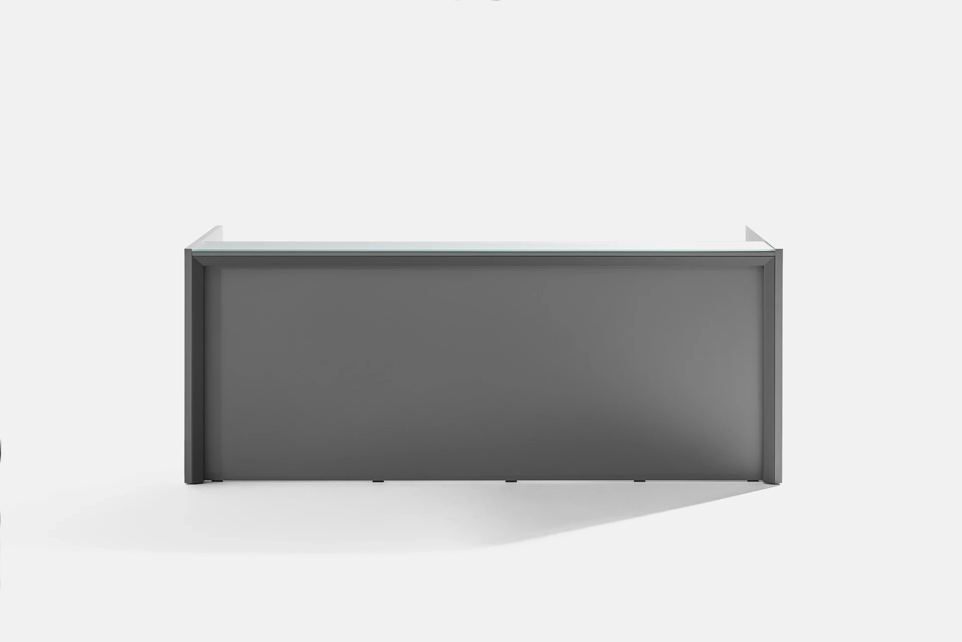 The desk surface can be made from tempered glass with a thickness of 10mm. The edges of the glass are diamond-shaped and polished, with a powder-coated color and a protective film underneath the glass. The glass is available in two versions: clear and polished or satin texture, with a variety of color options available for the client to choose from.