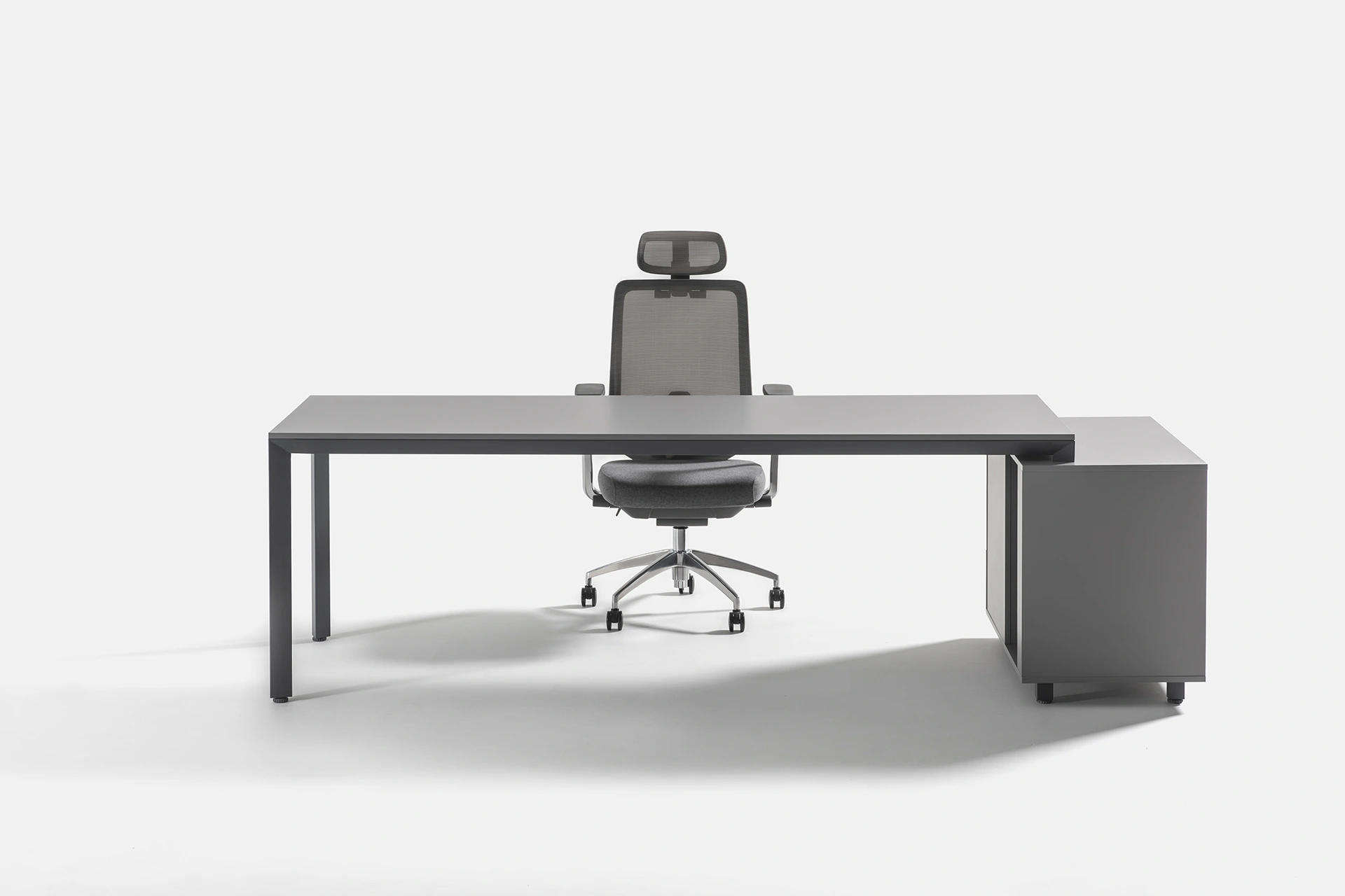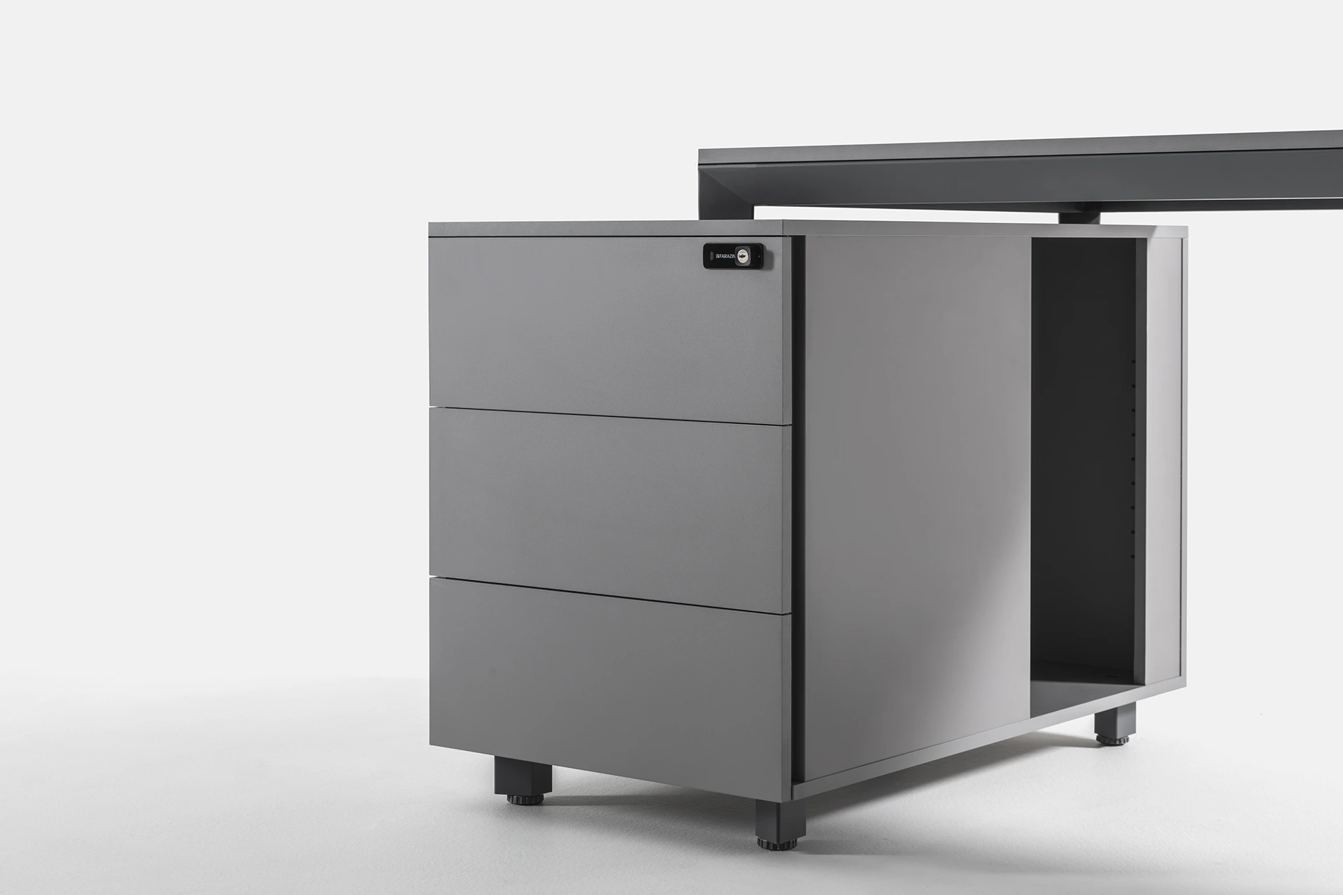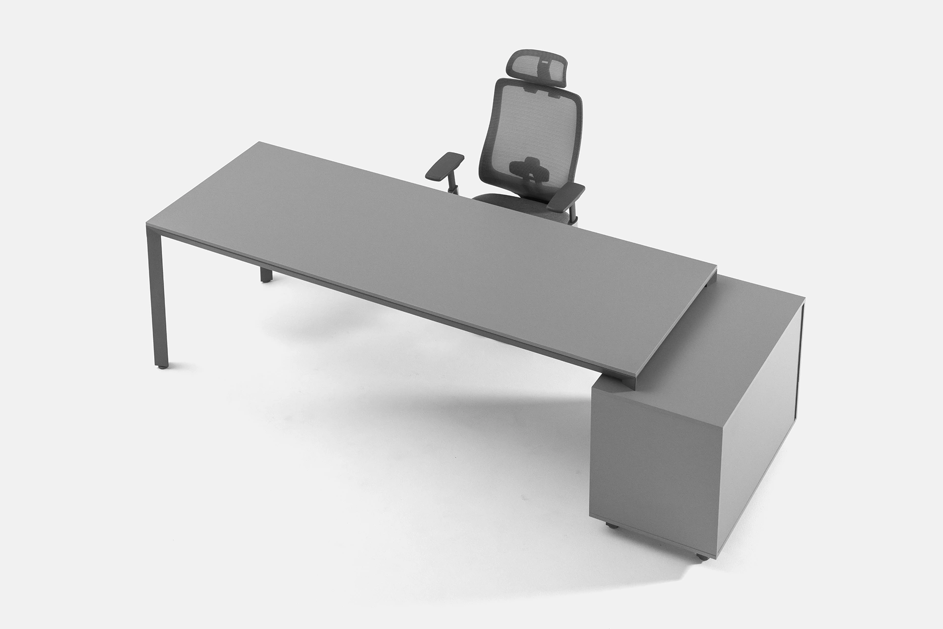 The desk top can also be made from 10 mm thick tempered glass. The edges of the glass are diamond-polished and glossy, with oven-baked paint and a protective film beneath the glass. The glass is available in two models: clear and polished or satin texture, with a wide range of colors available for the client to choose from.