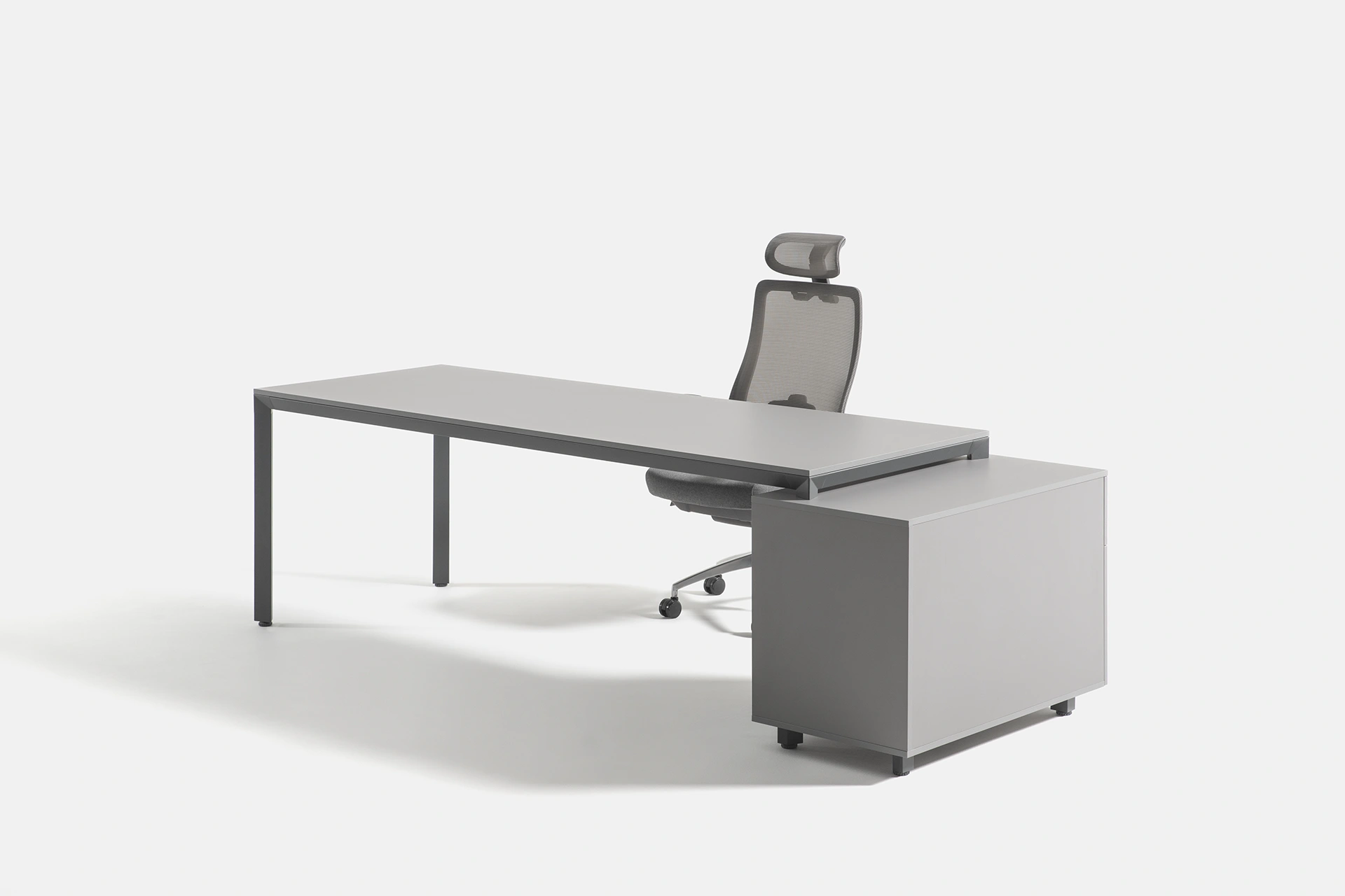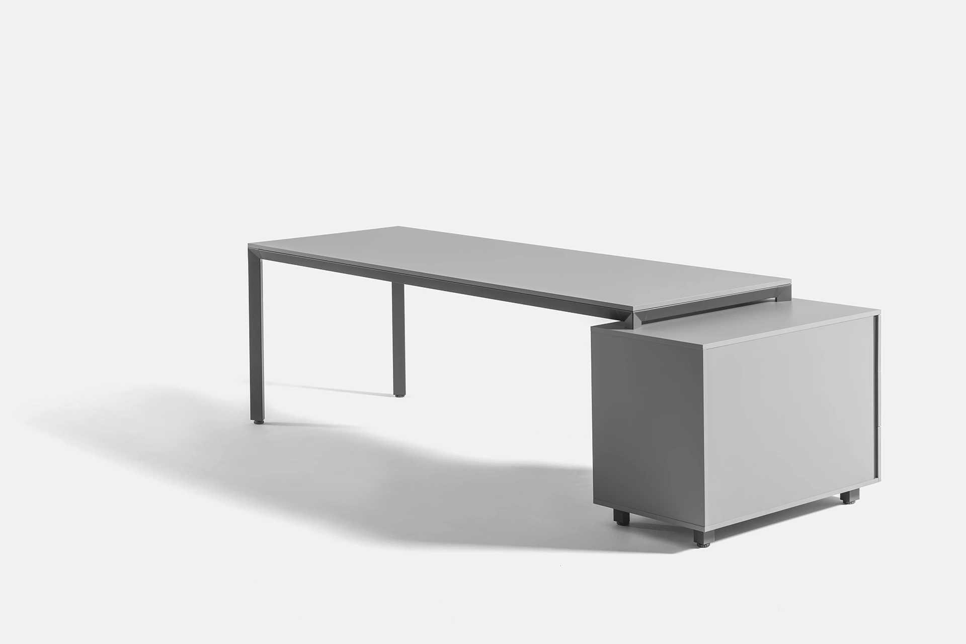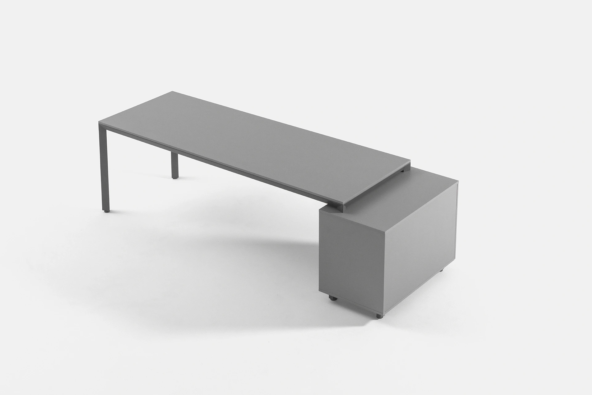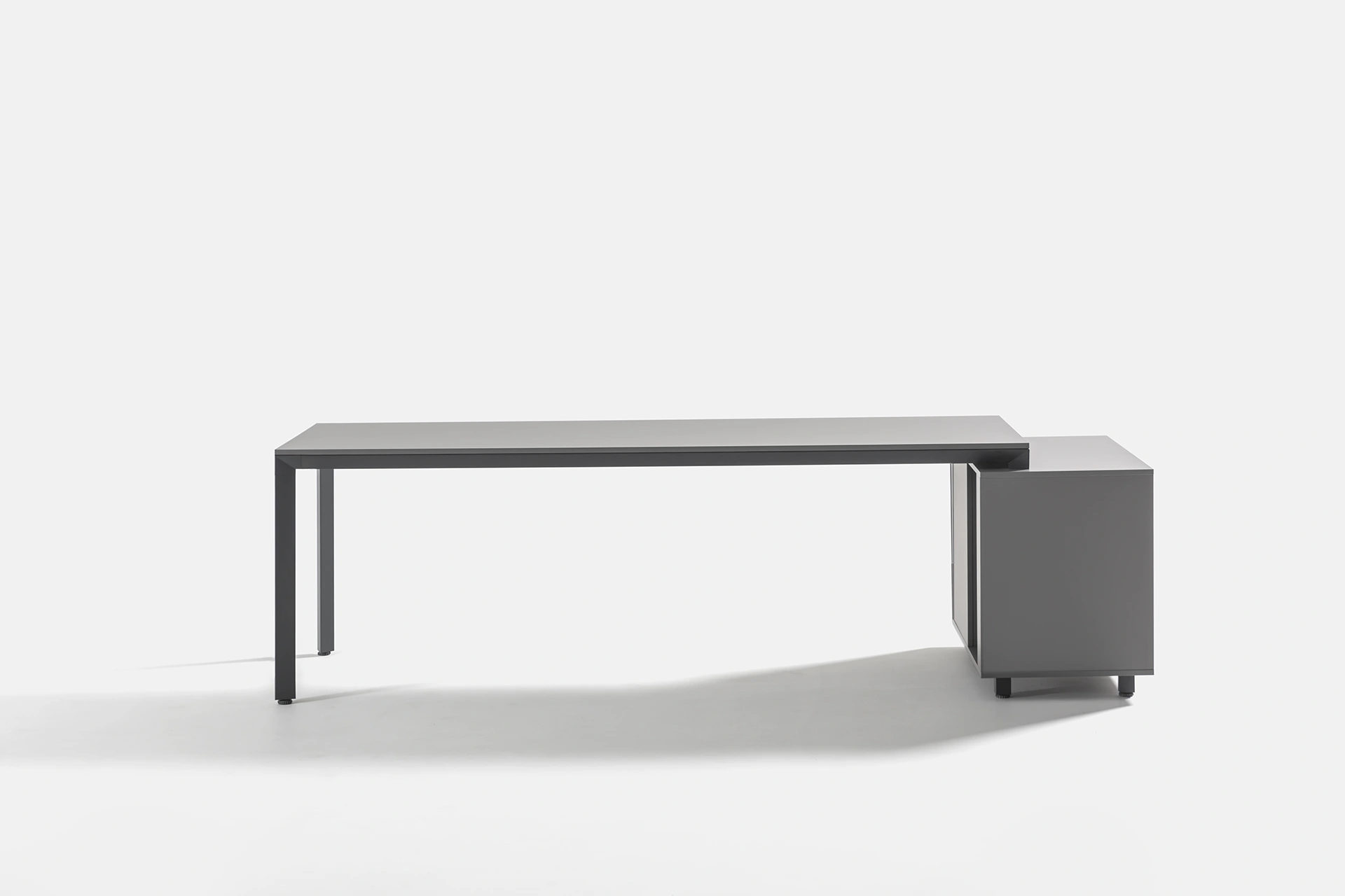 The desk top can also be made from 10 mm thick tempered glass. The edges of the glass are diamond-polished and glossy, with oven-baked paint and a protective film beneath the glass. The glass is available in two models: clear and polished or satin texture, with a wide range of colors available for the client to choose from.