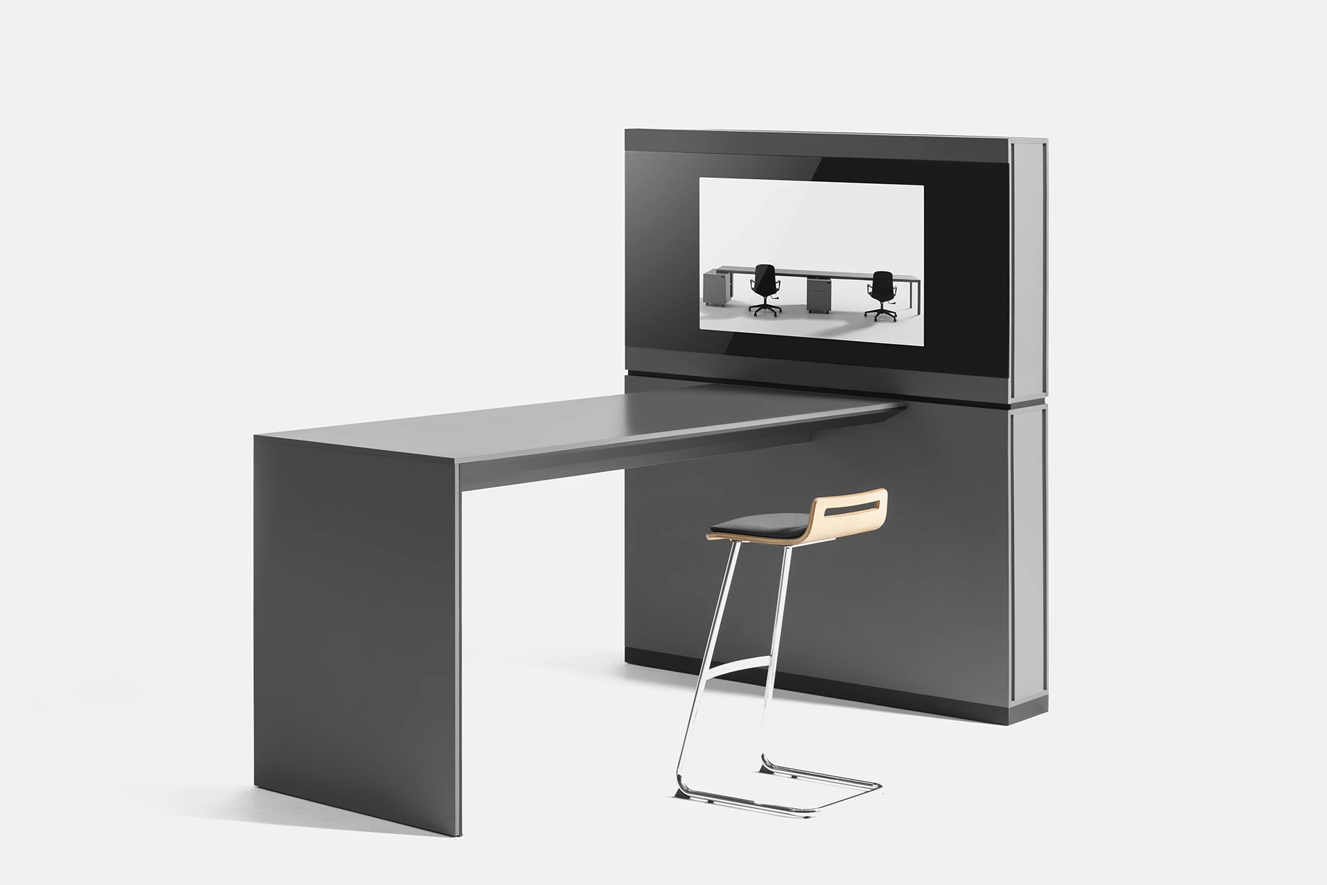 This display stand unit with an attached desk is designed with adjustable heights to facilitate meetings with a display. The flexible desk design ensures easy access to contents and equipment while allowing the unit to be placed anywhere within the organization without restrictions.