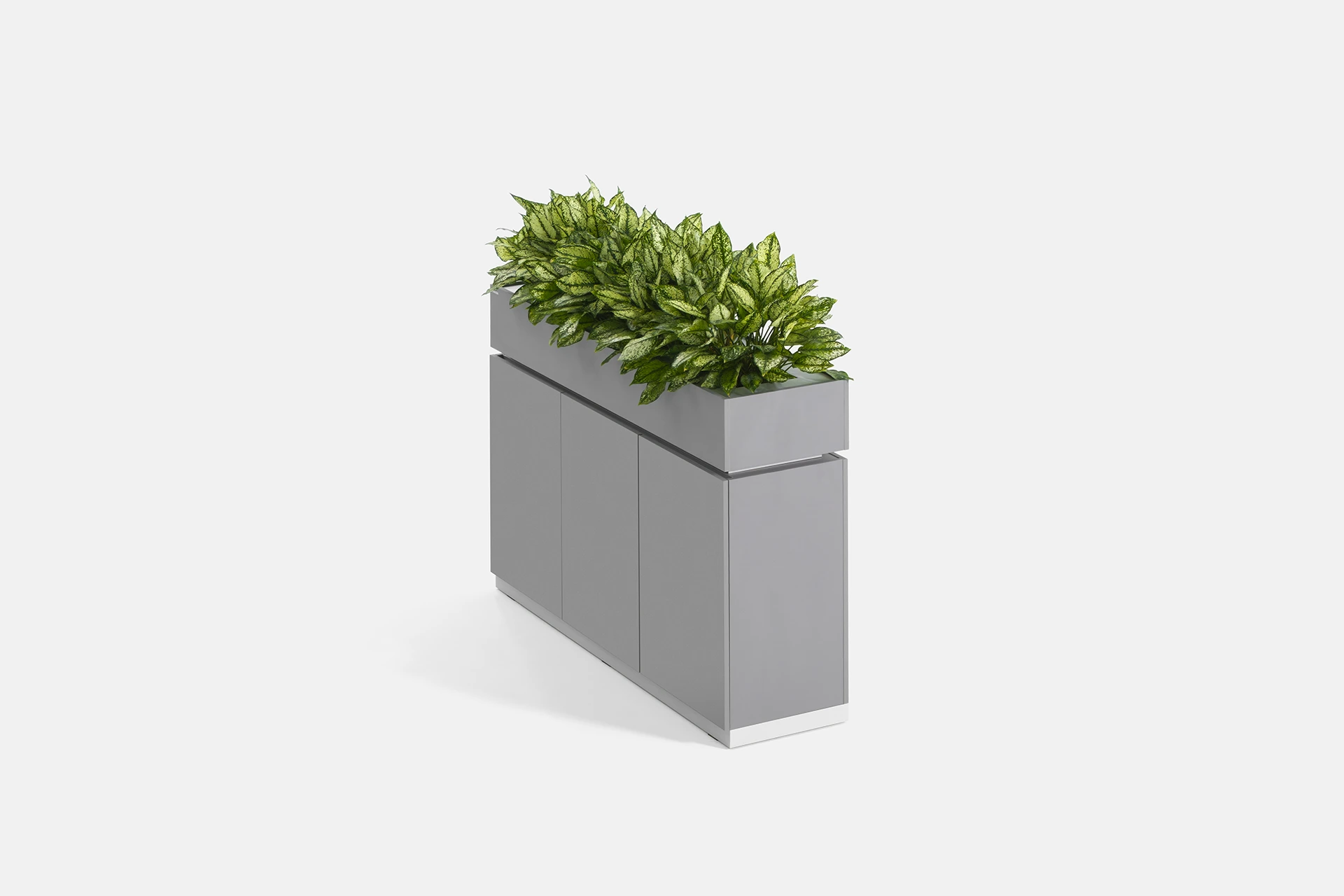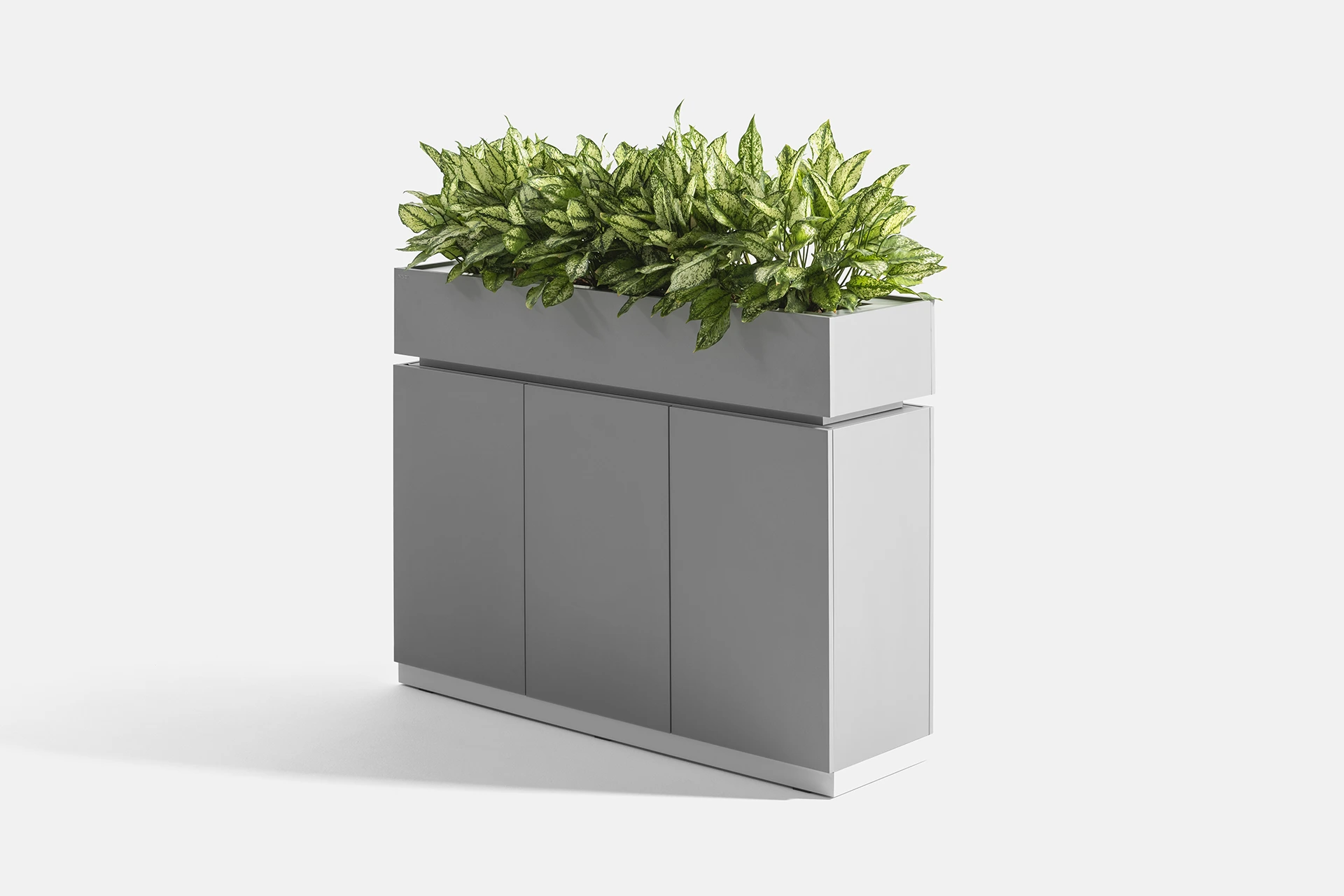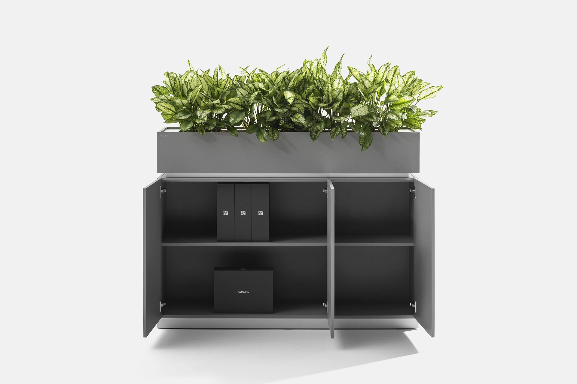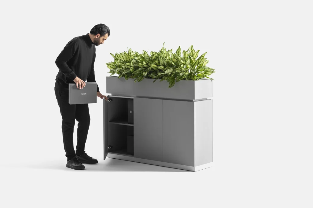 This cabinet features a door and a compartment in the lower section, providing optimal storage for documents and items. The top part of the cabinet is designed as a space for holding plants, bringing the presence of greenery and a sense of freshness into the workspace, creating a dual-purpose experience of functionality and beauty.