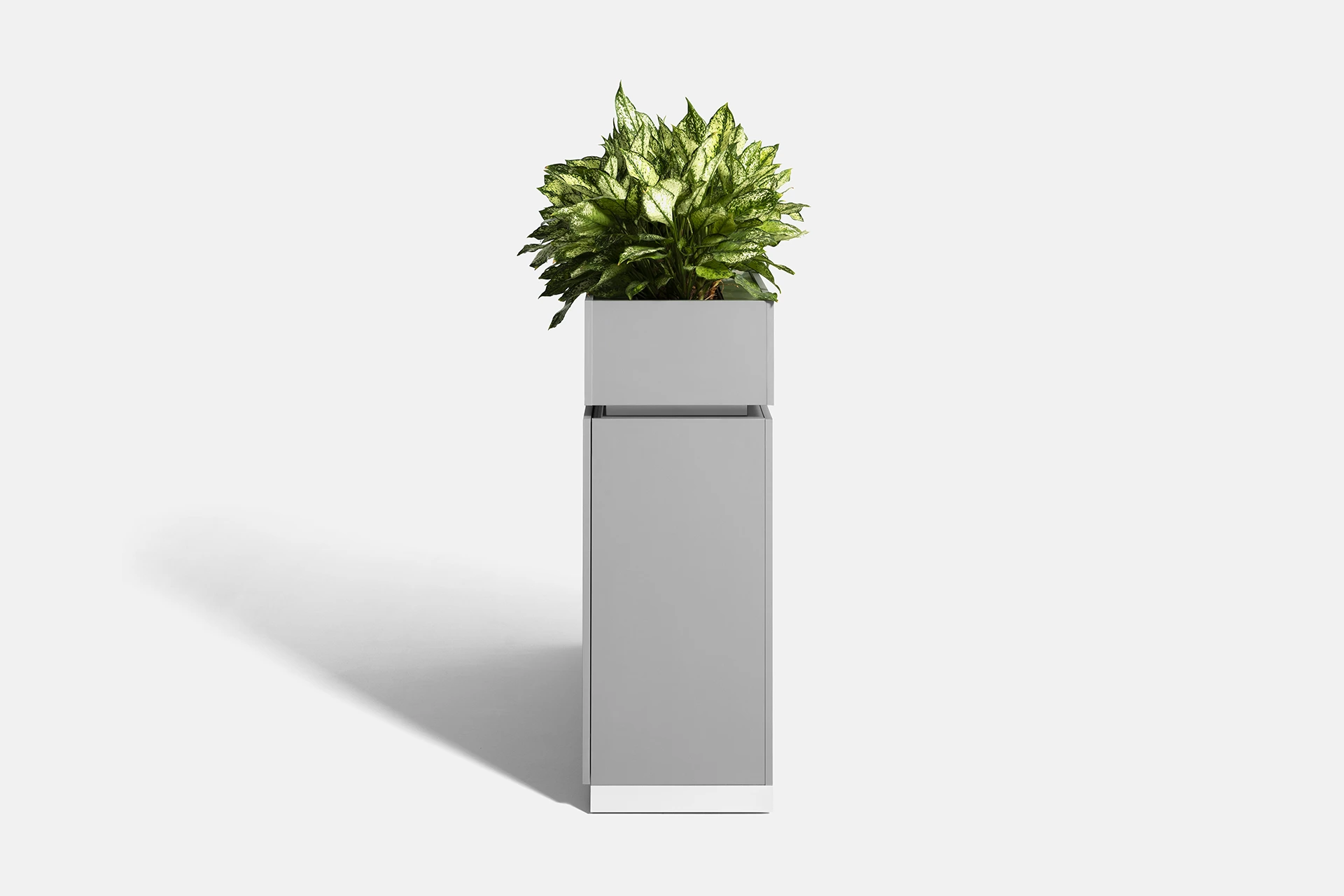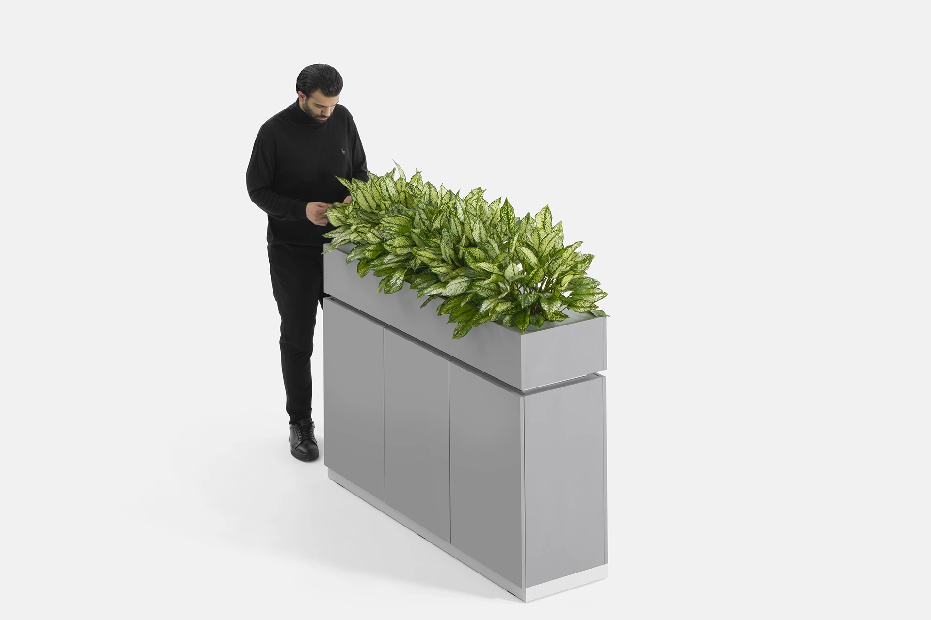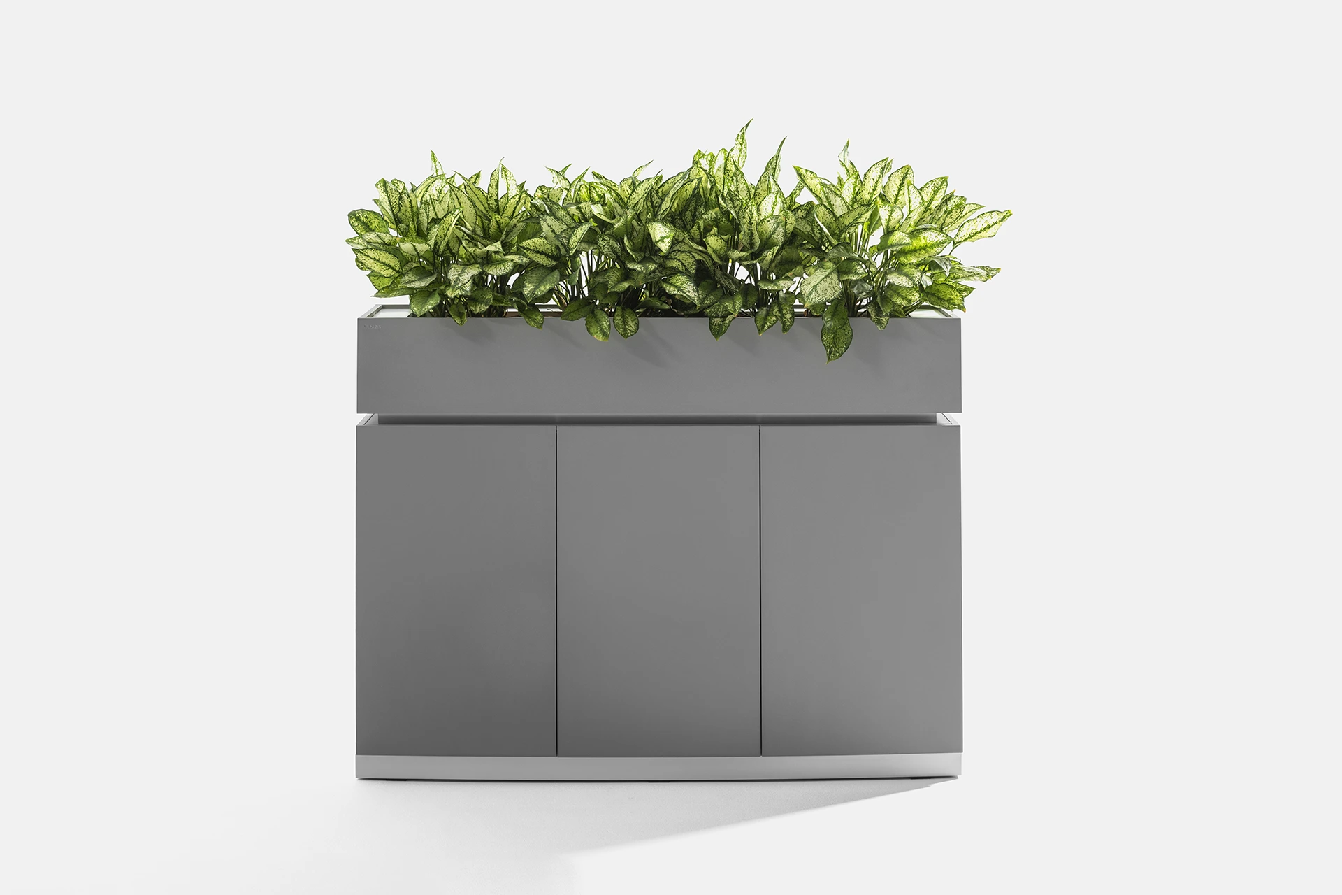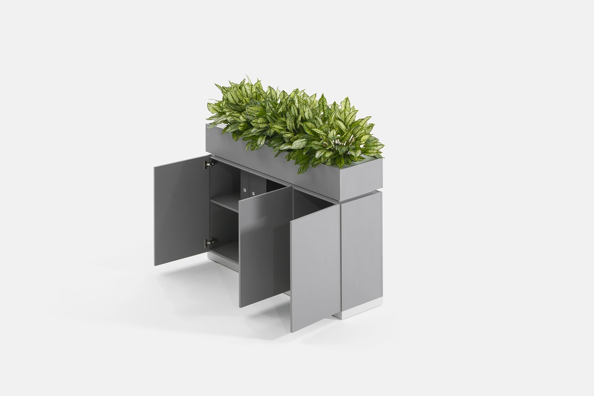 This cabinet features a door and a compartment in the lower section, providing optimal storage for documents and items. The top part of the cabinet is designed as a space for holding plants, bringing the presence of greenery and a sense of freshness into the workspace, creating a dual-purpose experience of functionality and beauty.