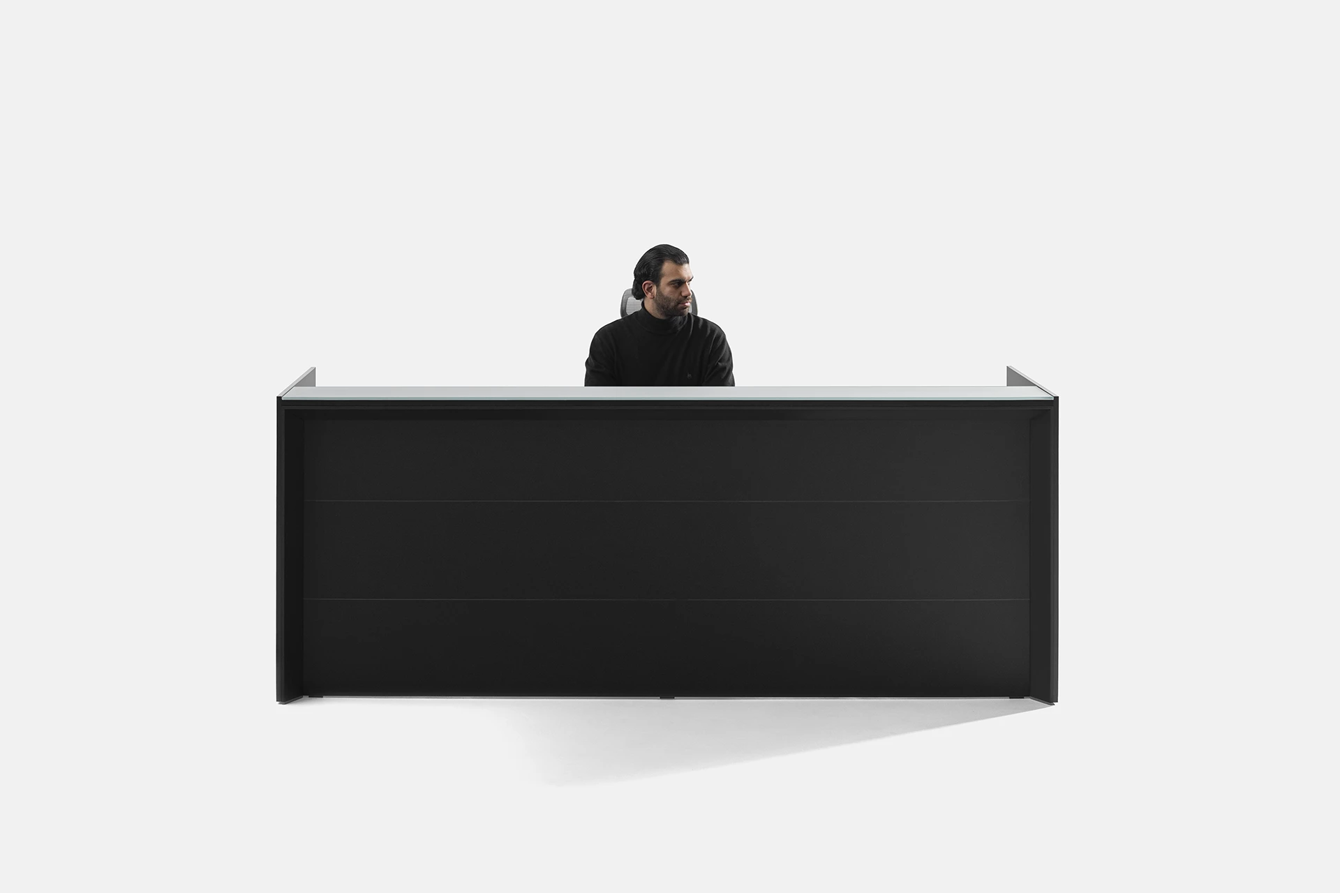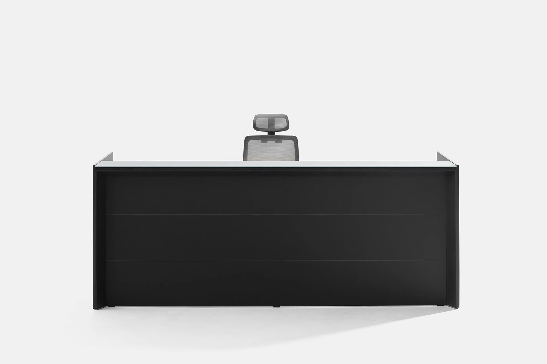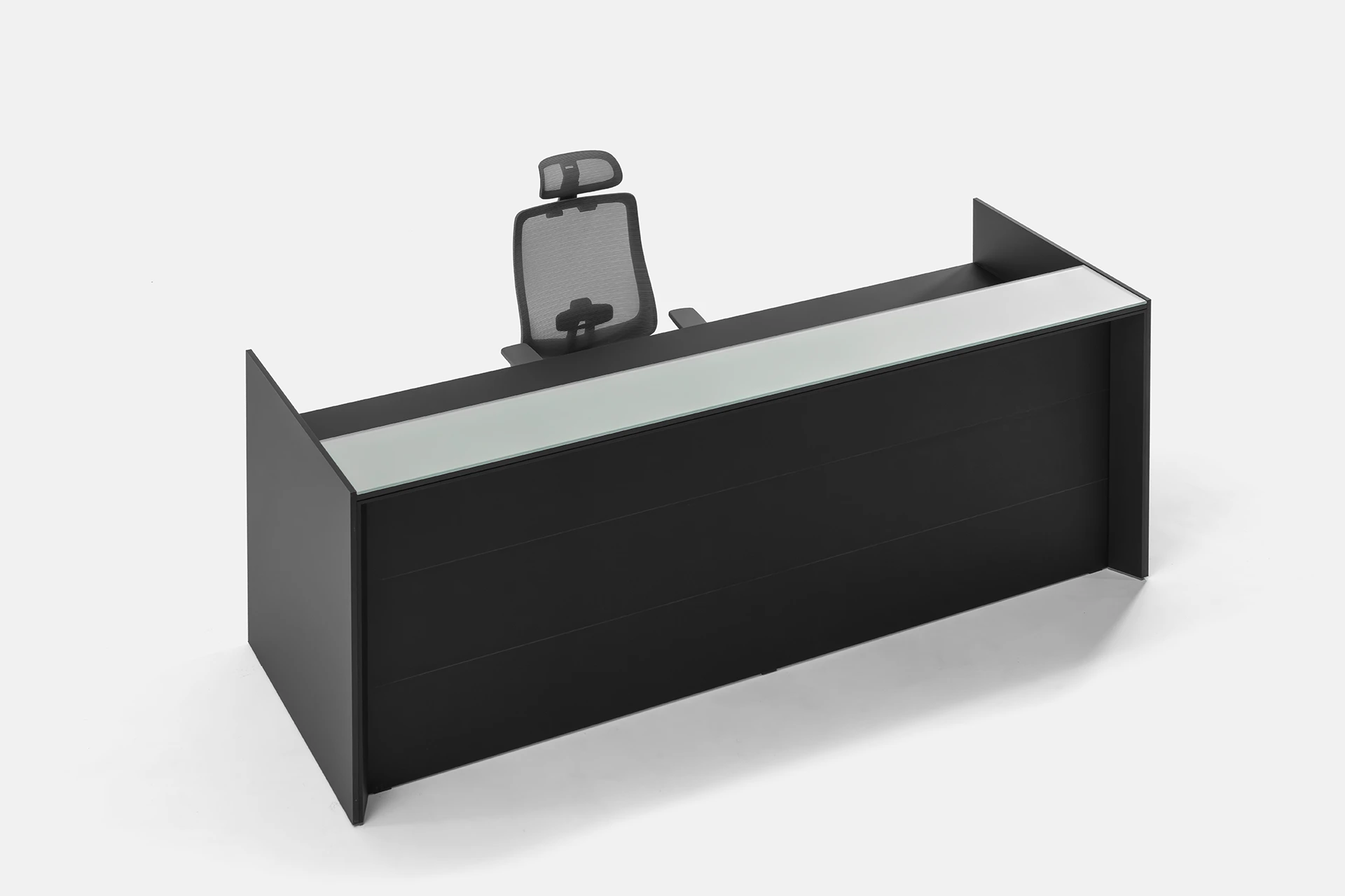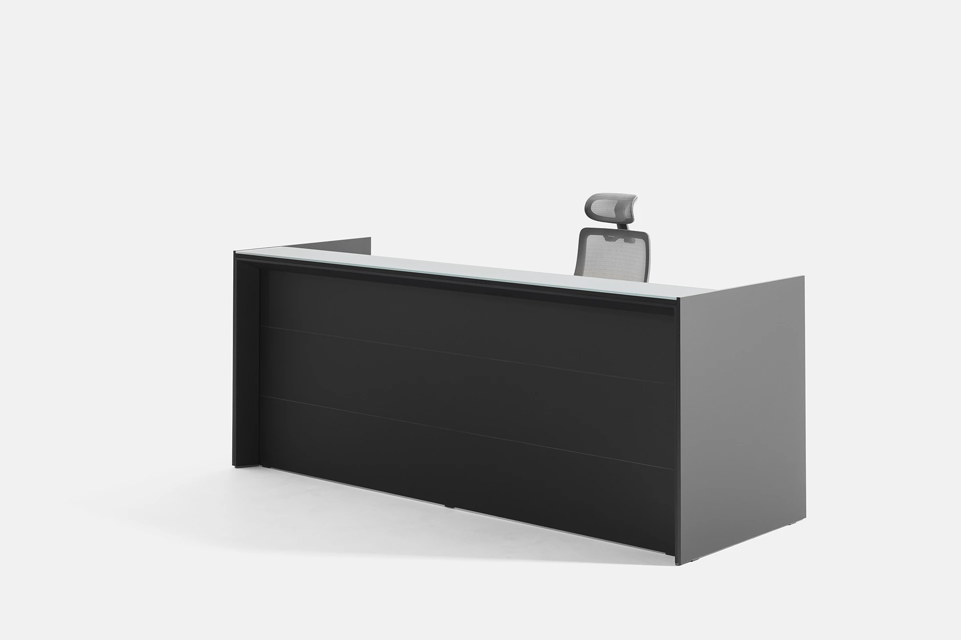 The desk top can be made of 10mm thick tempered glass. The glass edges are diamond-cut and polished, with a powder-coated finish and a protective film underneath. The glass is available in two options: clear and glossy or satin-finish textures, with a wide range of colors available for selection by the client.