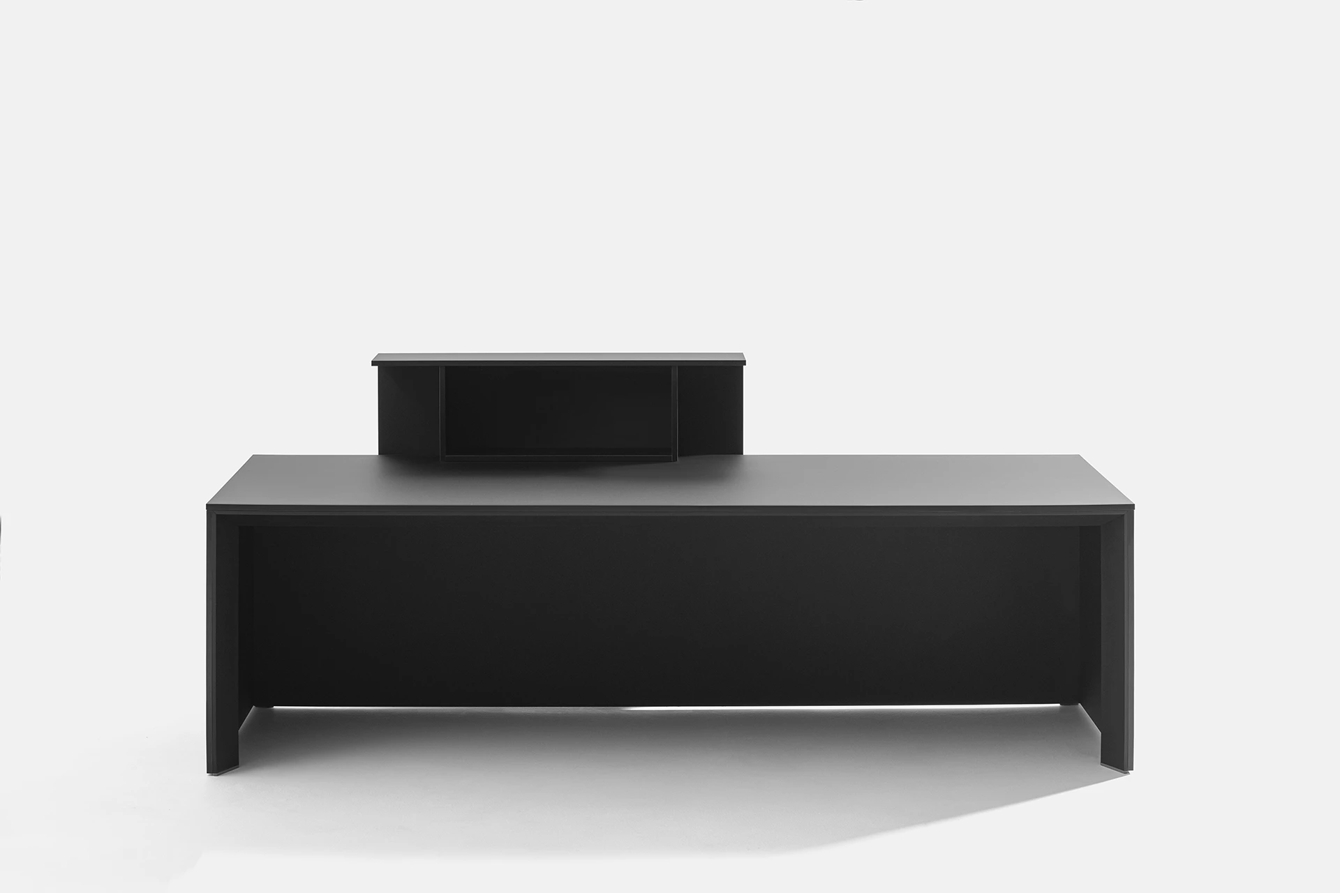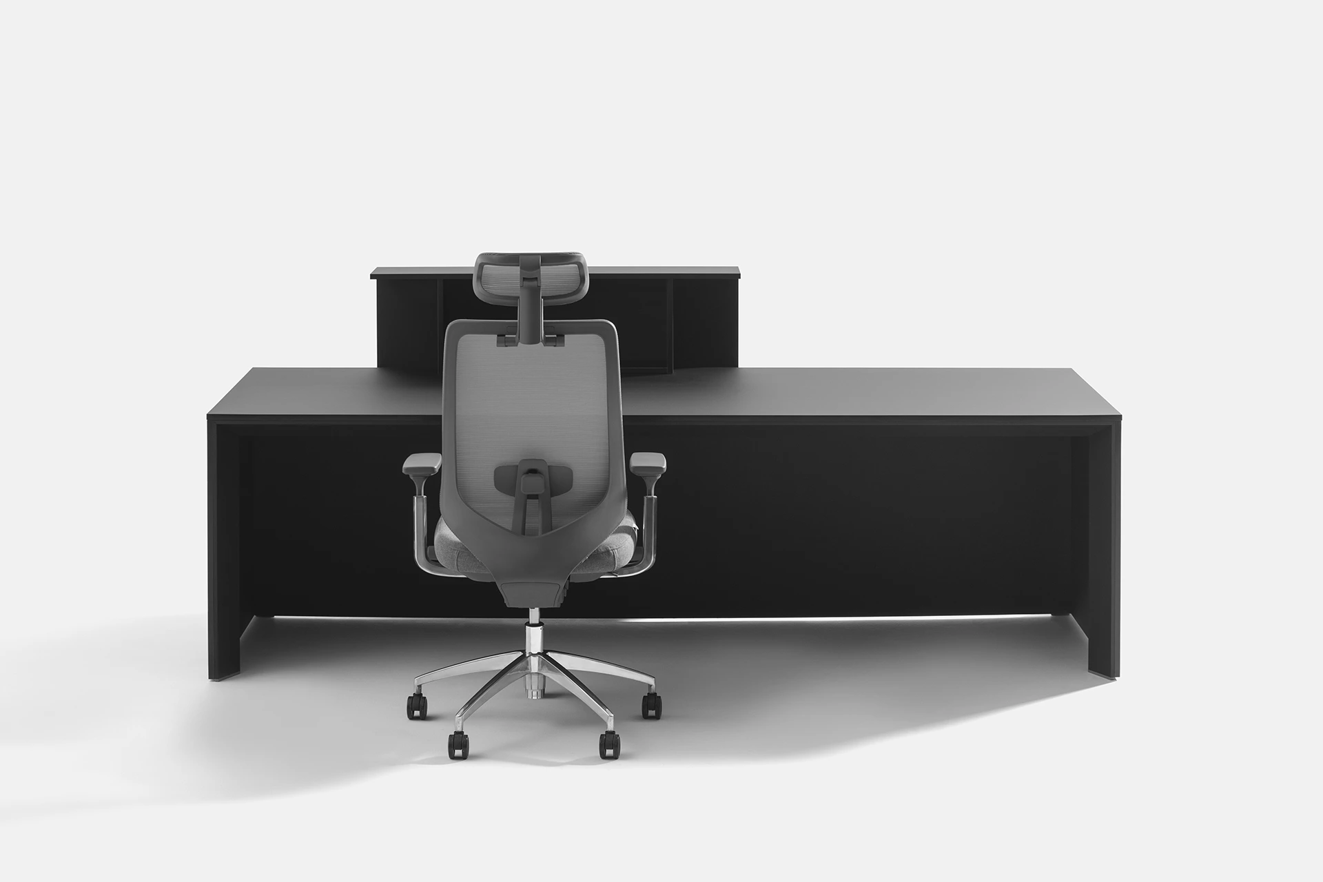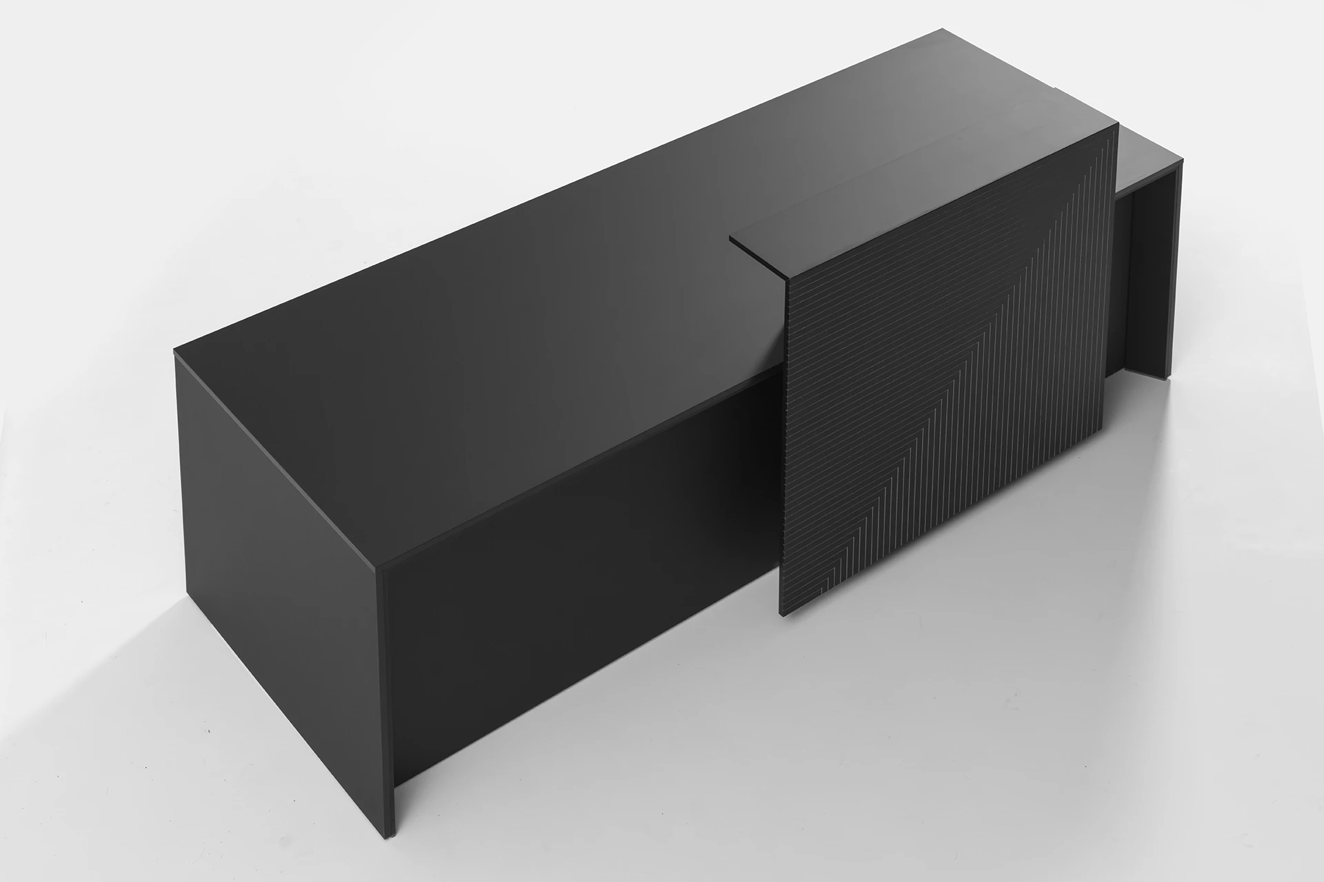 The desk’s top can be made from 10mm thick tempered glass. The glass edges are diamond-cut and polished, with an oven-baked color finish and a protective film underneath. The glass is available in two models: clear and polished or satin texture, and can be selected from a wide range of colors by the client.