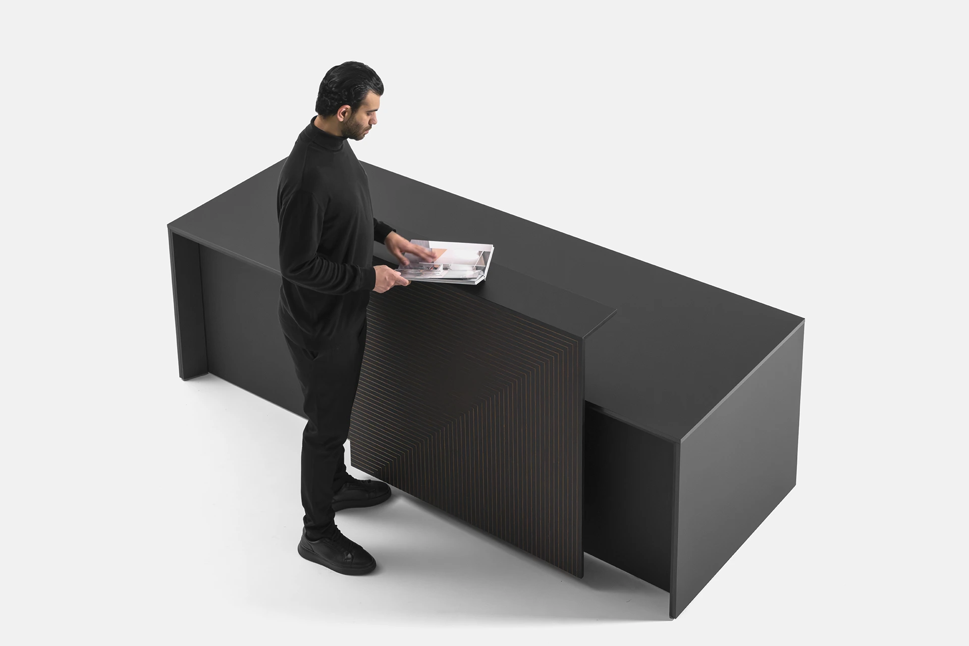 The desk can also be offered with a veneer (natural wood) finish, with the color treatment customized according to the client’s choice.