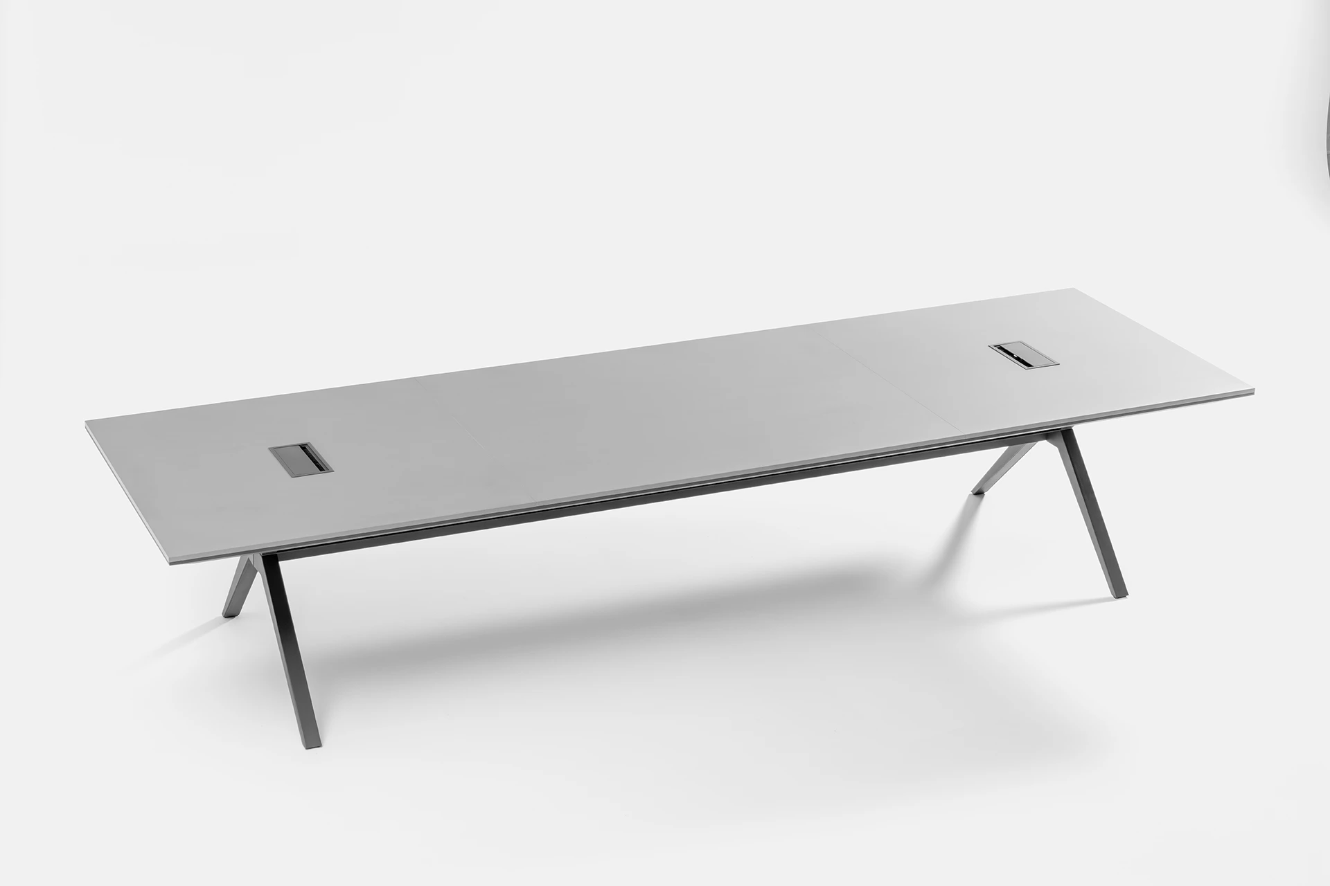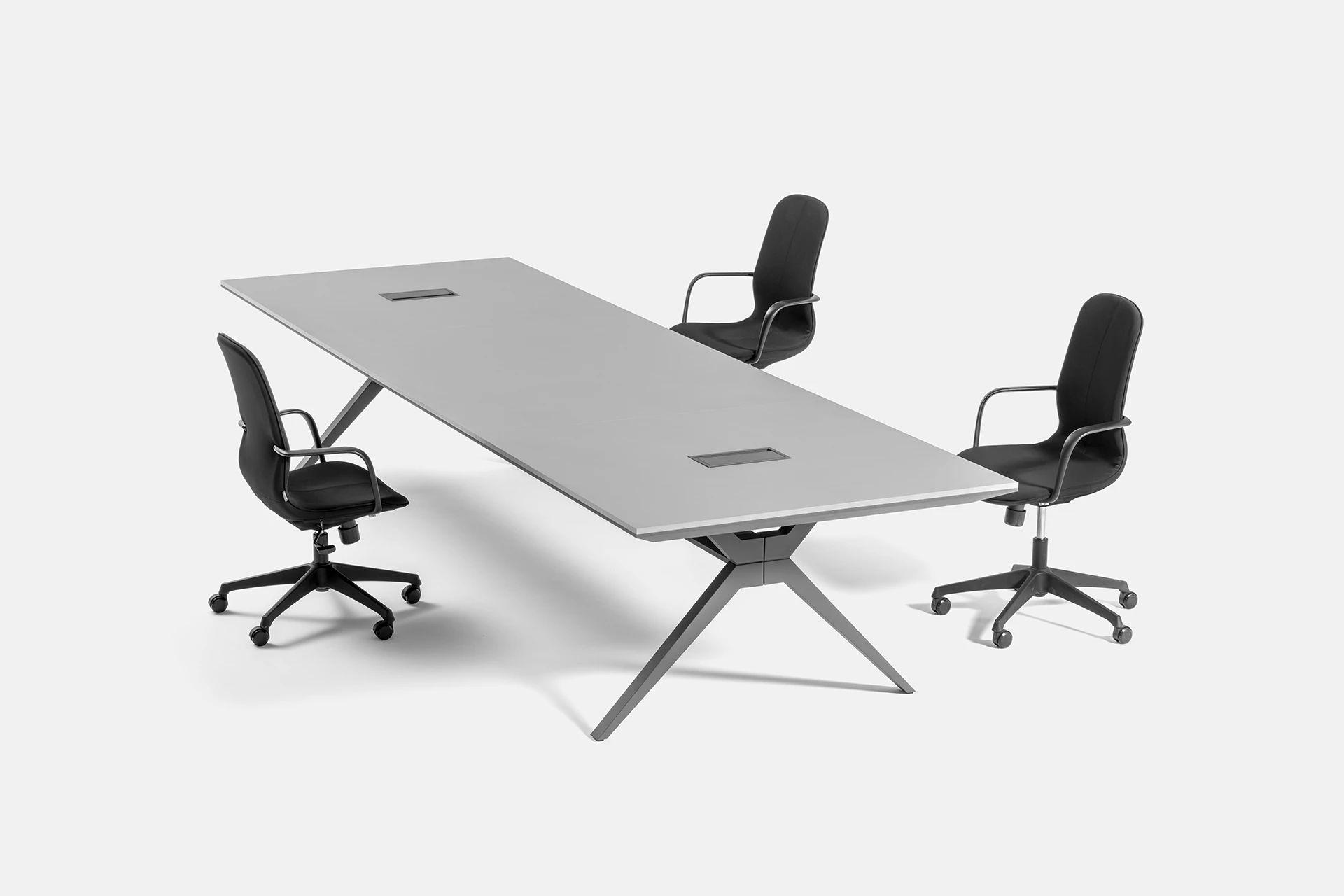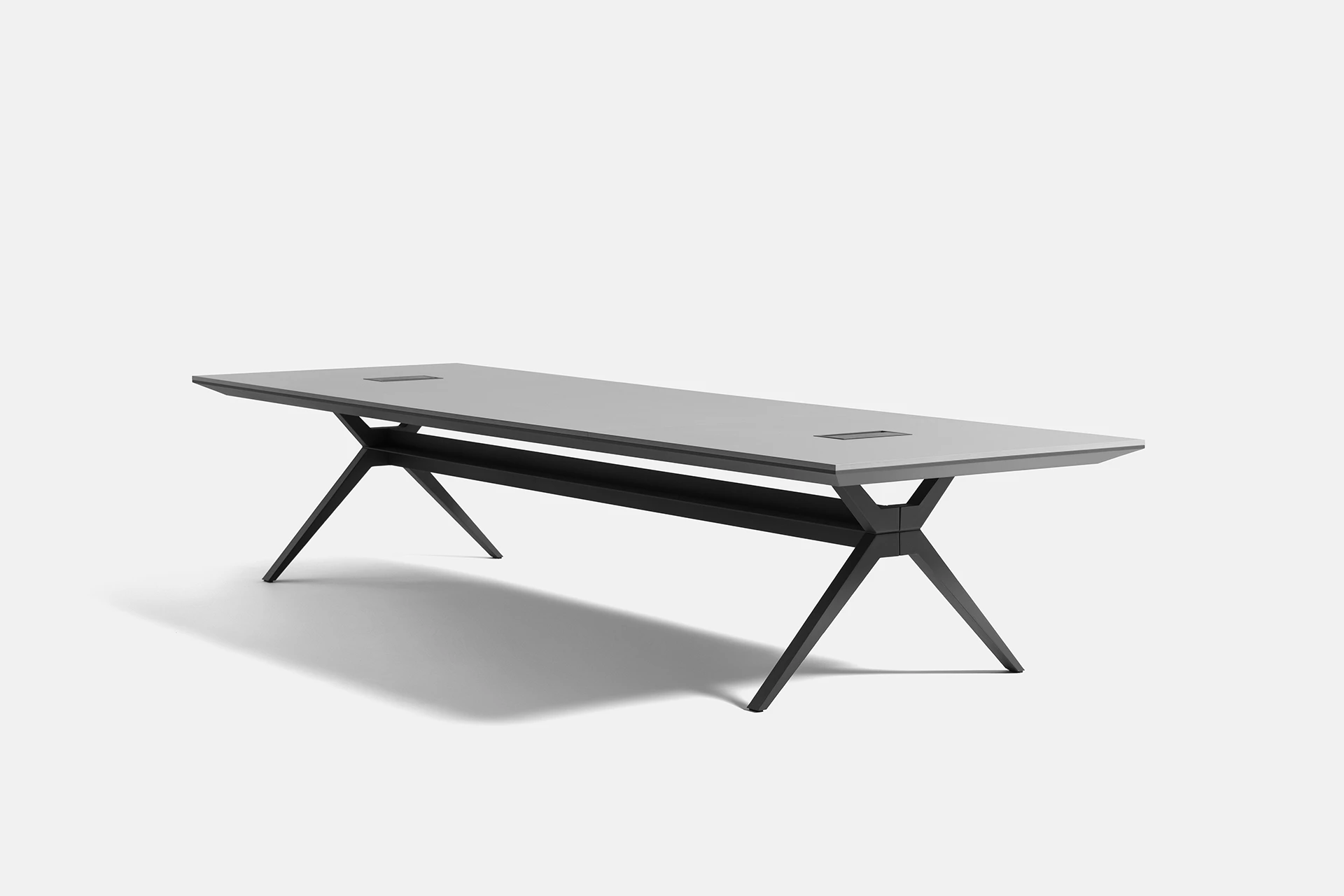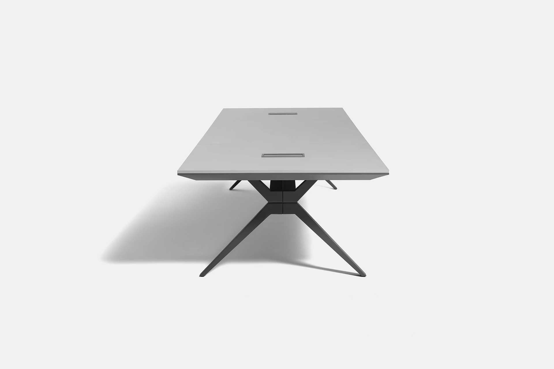 This conference table features a full-aluminum structure with two X-shaped legs designed with engineering precision. The sharp and unique angles of the legs provide exceptional strength and stability to the table. The distinctive and exclusive design of the legs adds a modern and appealing touch to the conference space.