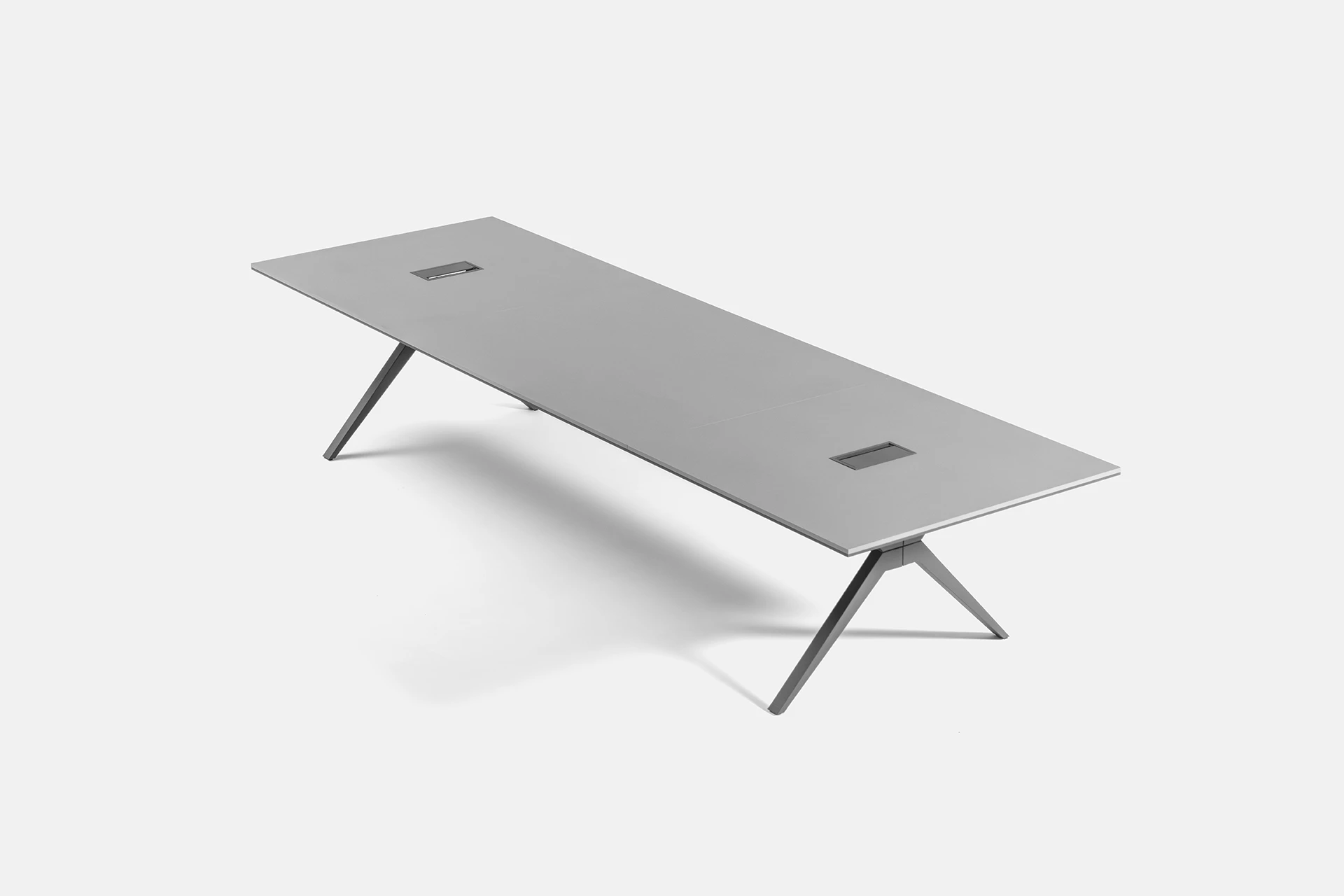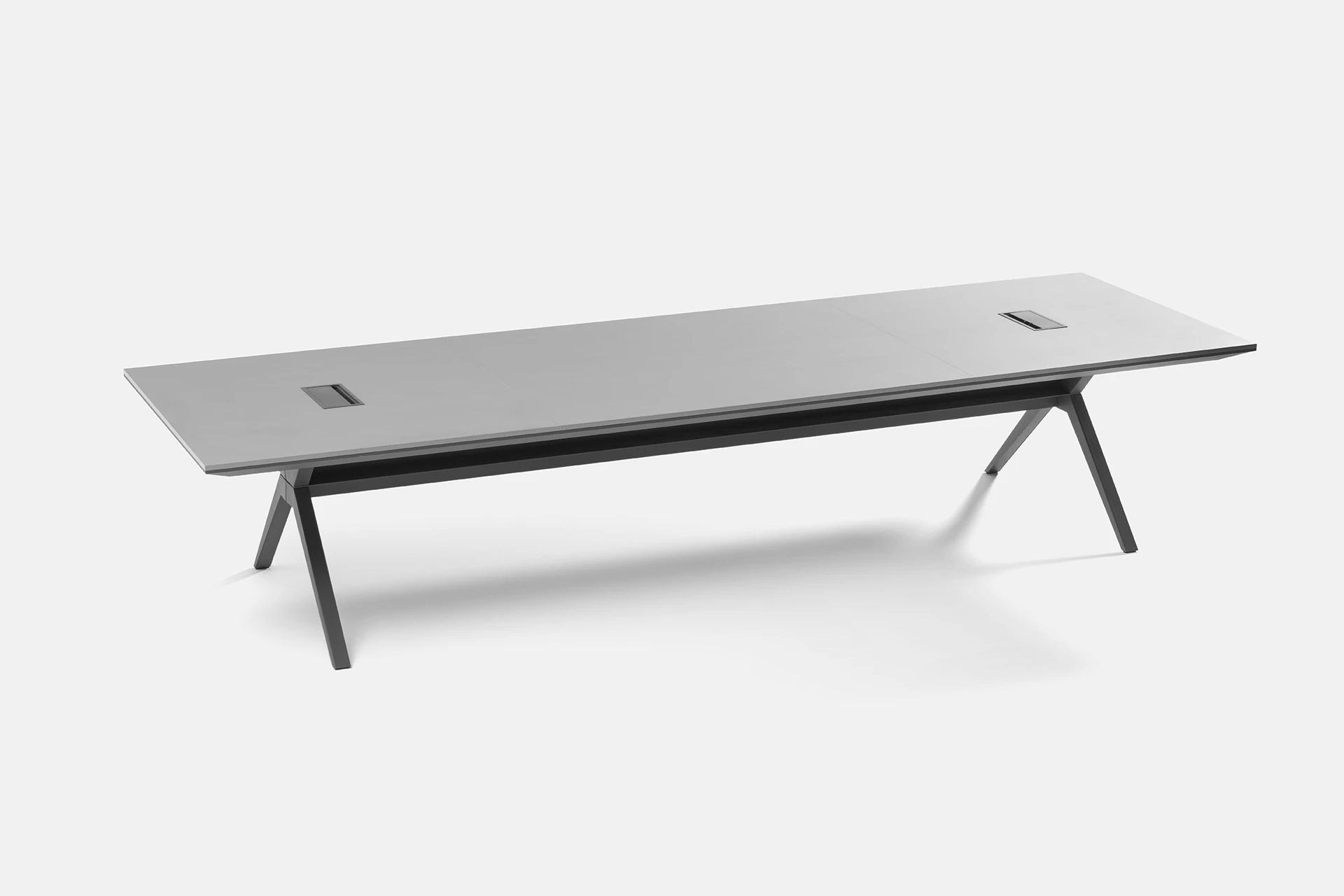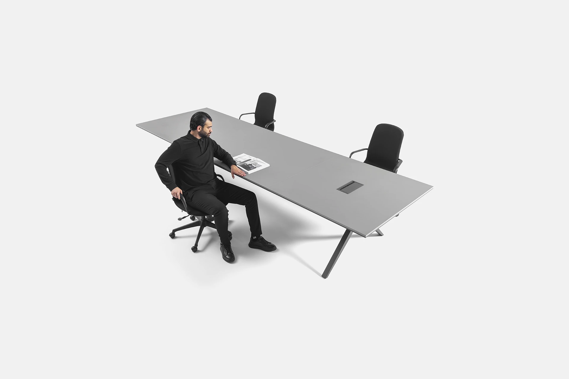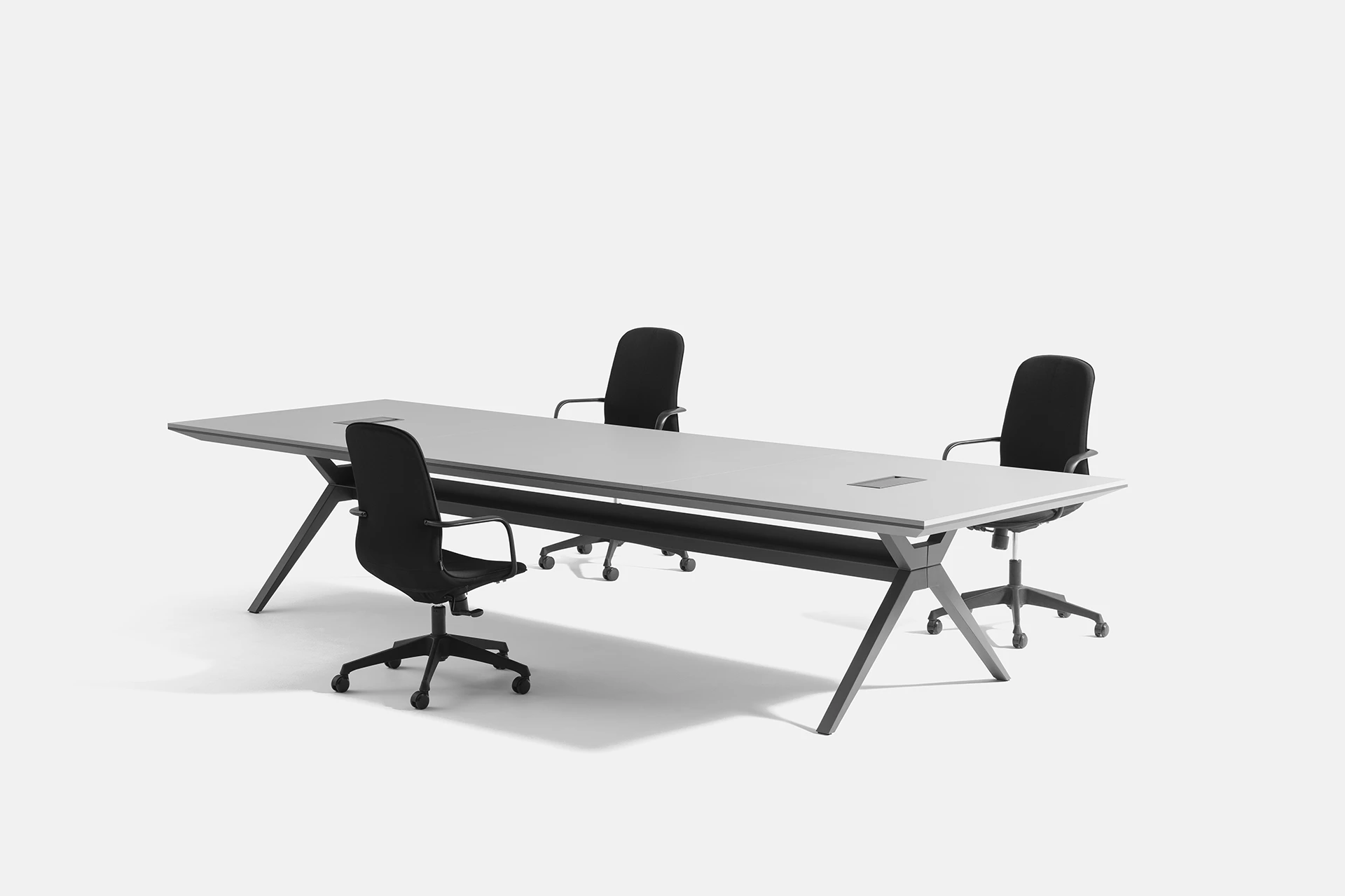This conference table features a full-aluminum structure with two X-shaped legs designed with engineering precision. The sharp and unique angles of the legs provide exceptional strength and stability to the table. The distinctive and exclusive design of the legs adds a modern and appealing touch to the conference space.