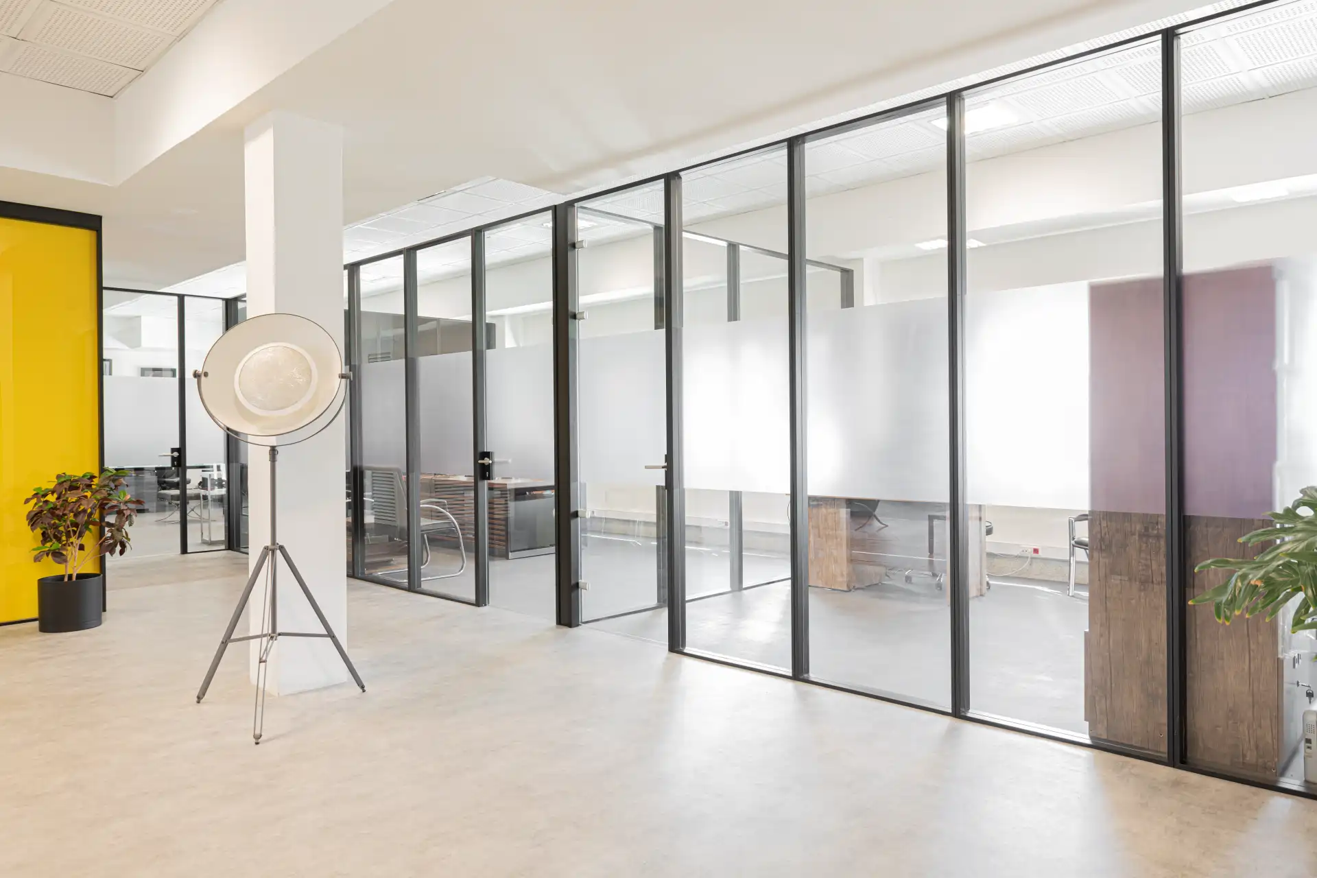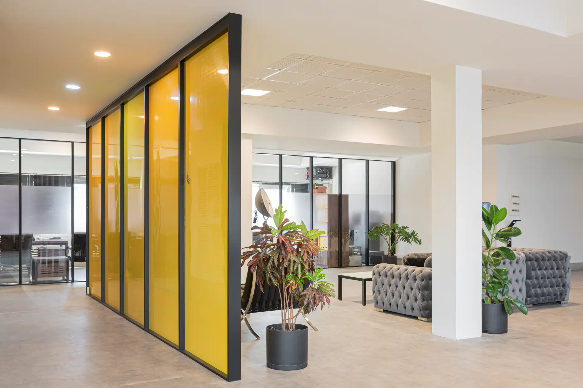 Request: Design and furnishing of the management office with versatile furniture and partitions, including writable glass surfaces and an integrated projection screen in the conference room.