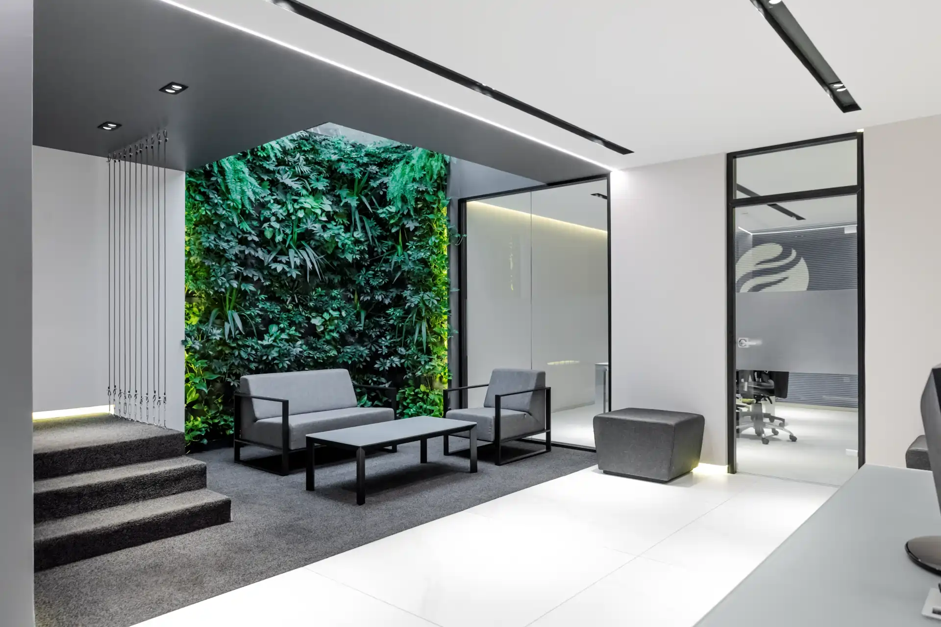 Request: Full harmony of Farazin products with the reconstructed space / Correct arrangement of Farazin products through following the structutral details installed in the space such as the green wall, carpet, and lighting.