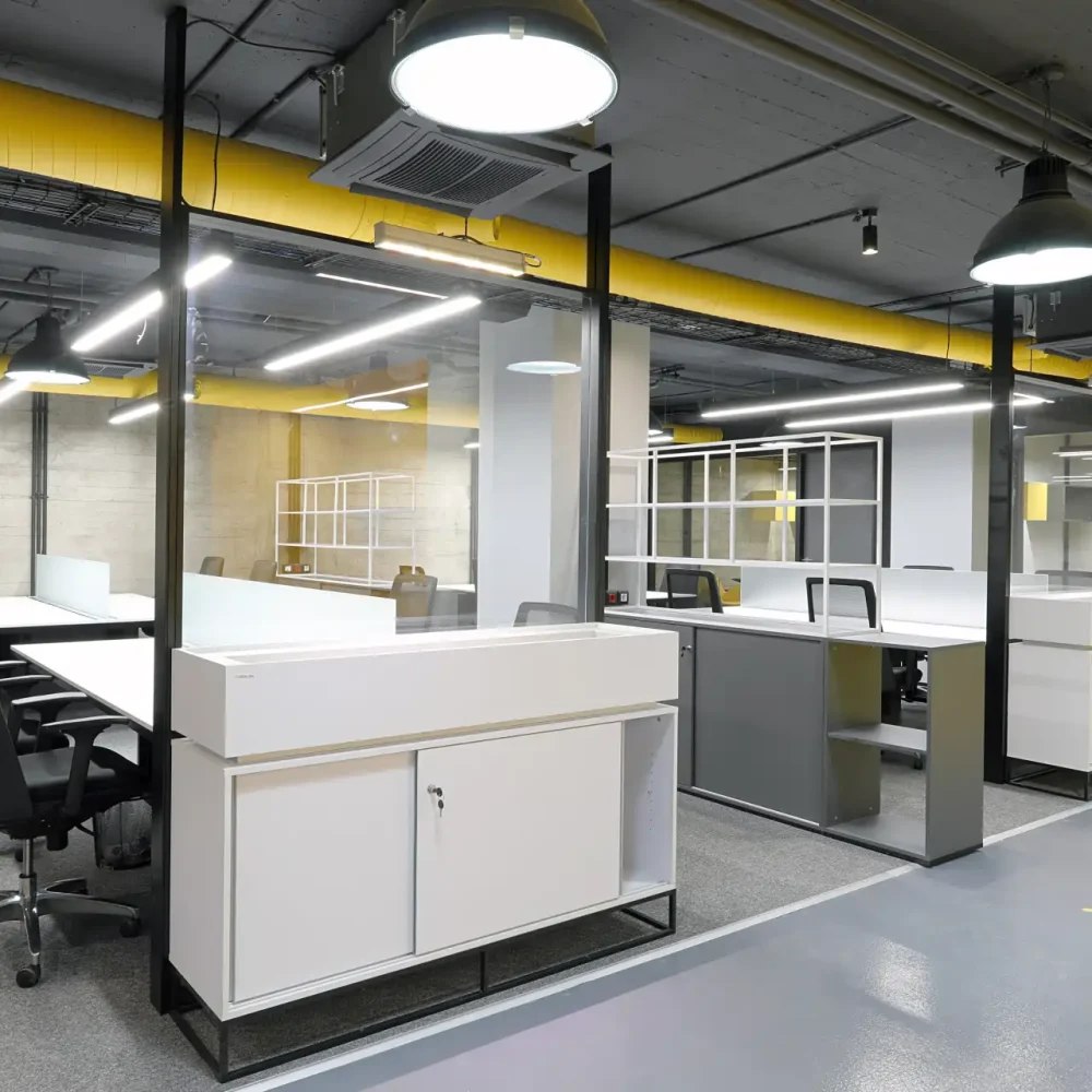 Request: Create unique and modern working spaces in high-ceiling halls.